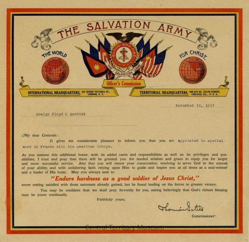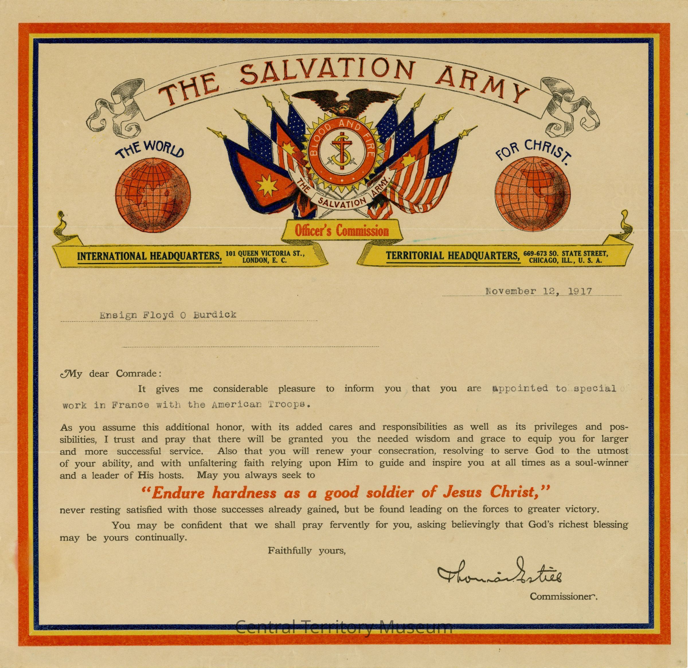 Cream/ecru paper. Red, yellow, and blue stripe border and Salvation Army decorative heading. Heading text reads: "THE SALVATION ARMY/ OFFICER'S COMMISSION/ INTERNATIONAL HEADQUARTERS, 101 QUEEN VICTORIA ST., LONDON, E. C. / TERRITORIAL HEADQUARTERS, 669-673 SO. STATE STREET, CHICAGO, ILL., U.S.S." Body of certificate text printed in black ink. Signed by the Commissioner.Acquisition