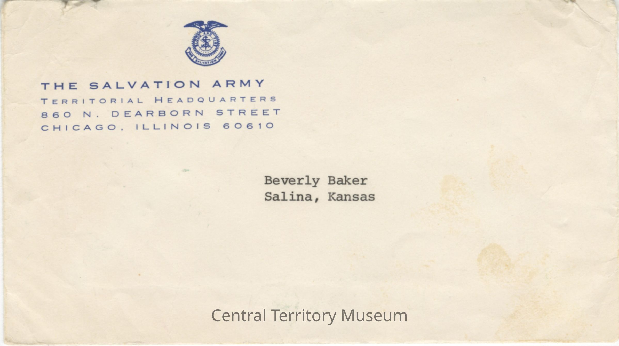 Black, white, and blue envelope sent to Beverly Baker in Salina, KS on Novemeber 4th, 1976. The top left has a large print of the THQ 860 Dearborn St, Chicago, IL address. Enclosed in the envelope was a letter and a achievement certificate card detailing Dr. Beverly Peterson recieving a Silver Palm award as part of the Girl Gaurds.