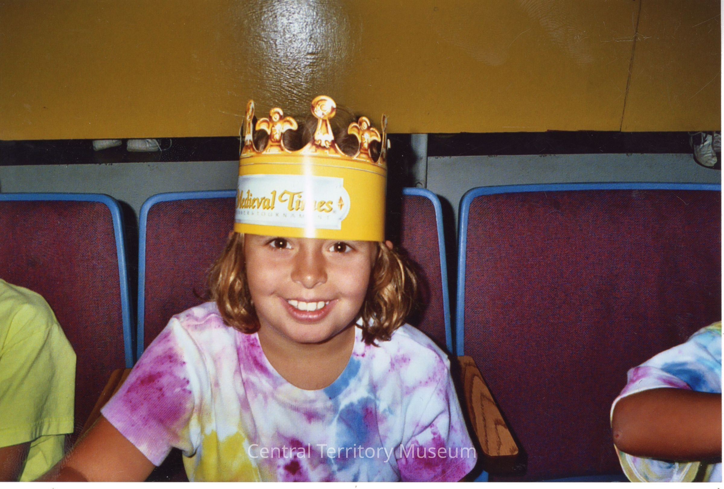 Color photo taken during a day camp hosted by the St. Charles (Tri-City), IL Corps. A girl, wearing a tie-dyed t-shirt and a yellow paper crown, smiles for the photographer. The crown has the Medieval Times logo printed across it.