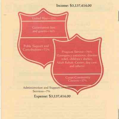 Tan, black, and red program. On the cover ther eis a graphic of a city skyline with a red heart at the top of one of the buildings. There are two beams shooting out of the red hear that read, "The Salvation Army Serving Kansas City Faithfully for 97 Years." This program is for the Annual Thanksgiving Celebreation for the Kansas City, MO Advisory Board. It was held at the Hyatt Regency Hotel on November 23rd, 1982 at seven p.m. The inside has information regarding award winners for that year and corps community information. The back has the financial statement from September 30th, 1981 where the income was $3,137,414.Acquisition