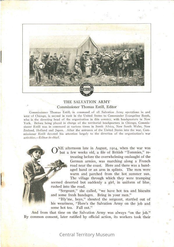 Fragment from the book (historical) "Illinois in The World War," first published by the Illinois State Historical Library in Springfield, Illinois in 1921. The fragment is one chapter, stapled together in two places along the lefthand side. The title of the chapter is "THE SALVATION ARMY" and was edited by Commissioner Thomas Estill. Above the title is a circular logo that says "THE SALVATION ARMY" along the top edge, "U.S.A." along the bottom edge, and "WAR SERVICE" across the middle. The pages contain a mixture of text and photographic images (black and white) pertaining to The Salvation Army's involvement in the World War I (particularly The Salvation Army U.S.A.).Acquisition