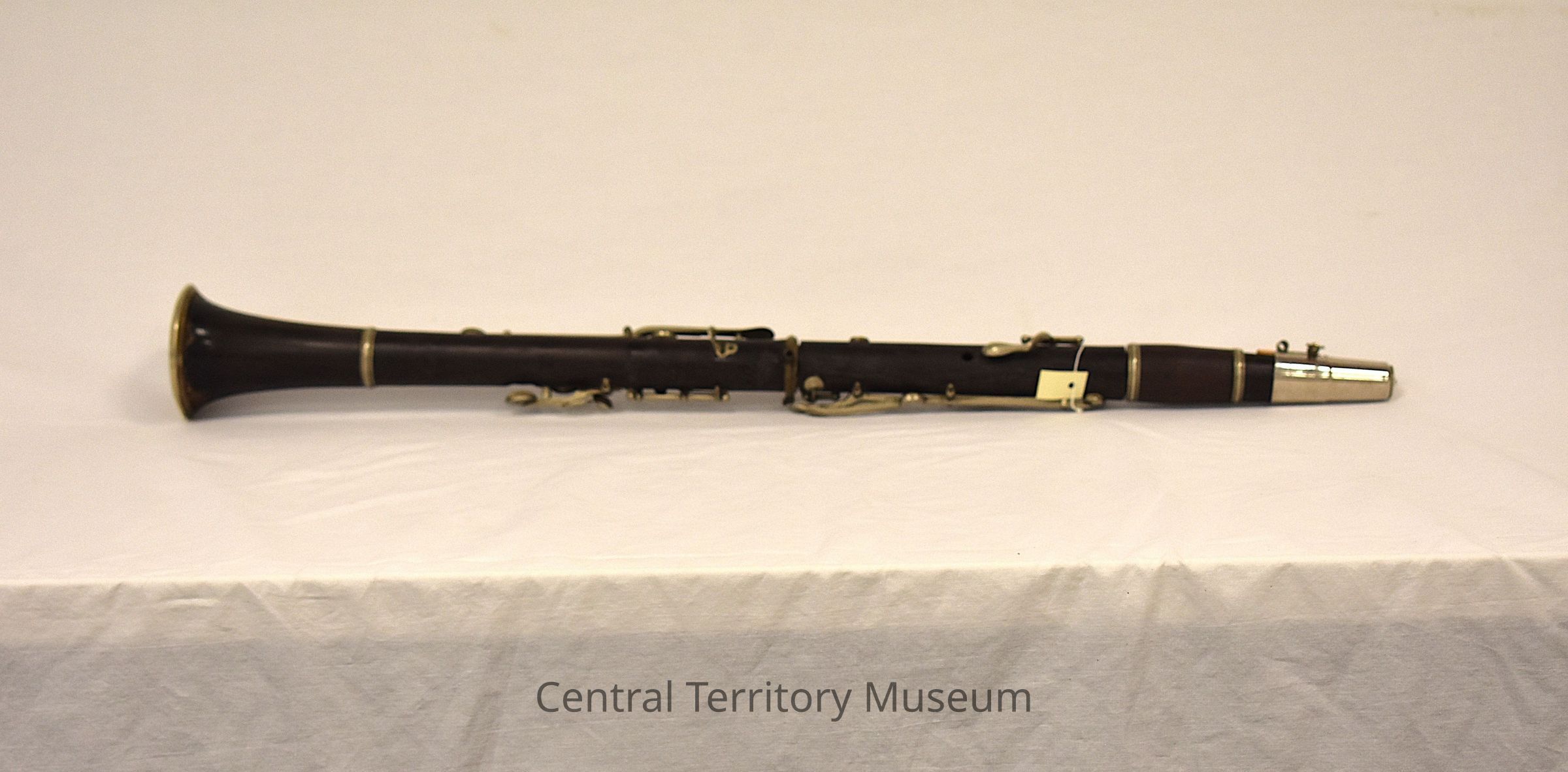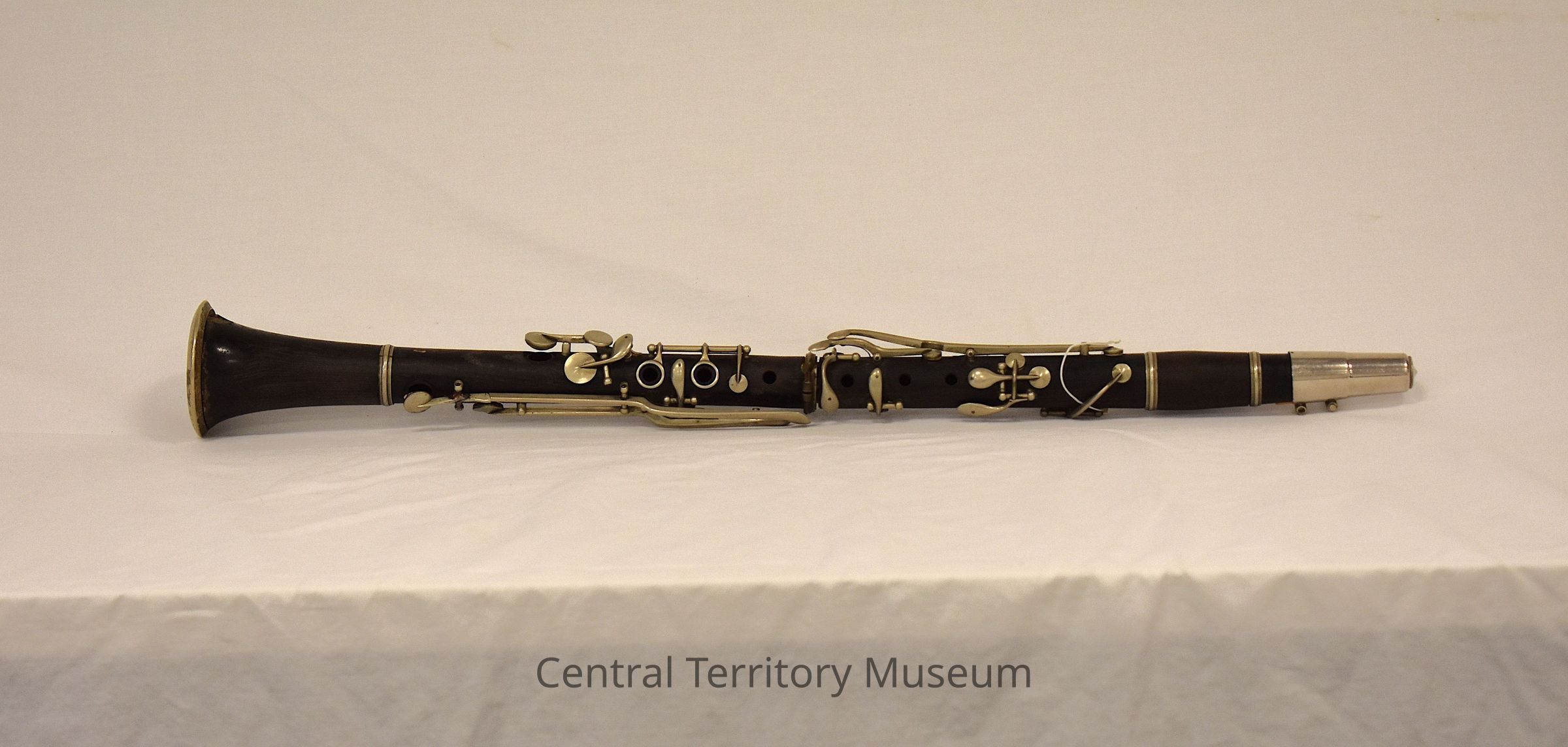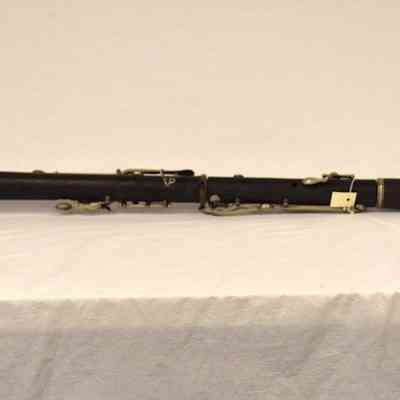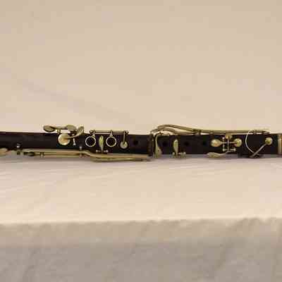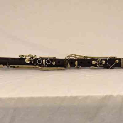 Clarinet in four sections. The clarinet is accompanied by a brown leather case.