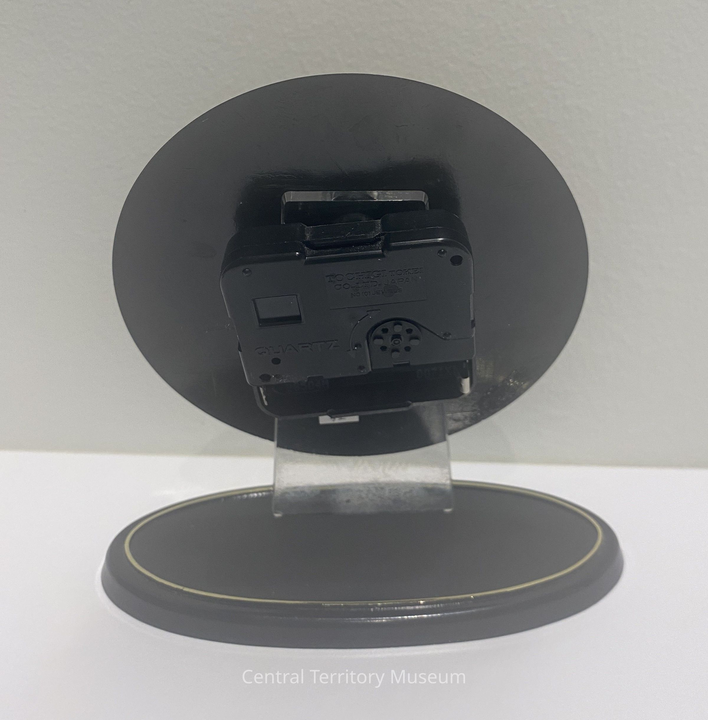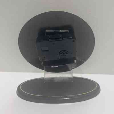 The back of the clock has a black plastic case containing the mechanism and a slot for a battery. A clear plastic tab protrudes from the case downward. A oval shaped black plastic case is included with the clock.Acquisition