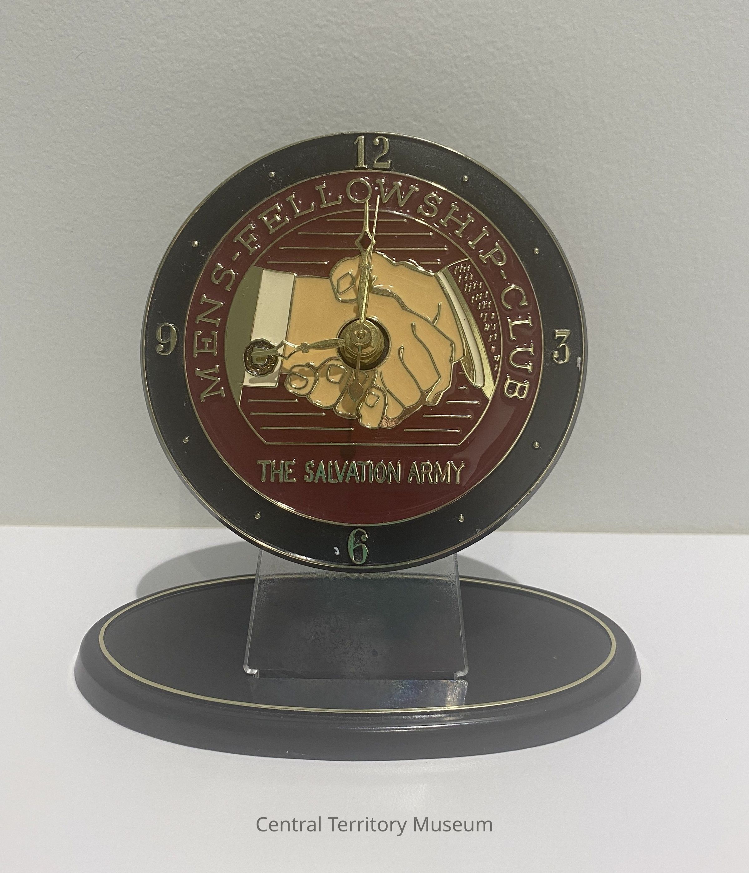 Round black plastic clock with gold numbers at 12, 3, 6, and 9 and with small gold dots representing the numbers in between. A maroon inner circle is imprinted Men's Fellowship Club / The Salvation Army. The center is the logo for the Men's Fellowship Club, a depiction of two male hands shaking. The two hour hands and the minute hands, all metallic, are fastened in the center. The hour hands are black plastic.