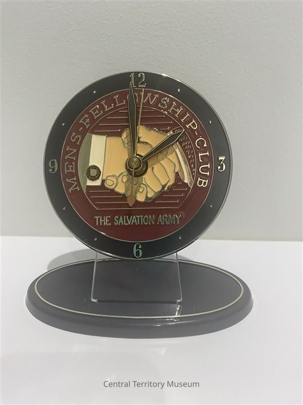 Round black plastic clock with gold numbers at 12, 3, 6, and 9 and with small gold dots representing the numbers in between. A maroon inner circle is imprinted Men's Fellowship Club / The Salvation Army. The center is the logo for the Men's Fellowship Club, a depiction of two male hands shaking. The two hour hands and the minute hands are fastened in the center. The hour hands are black plastic with gold outlining the edges. The minute hand is metal.