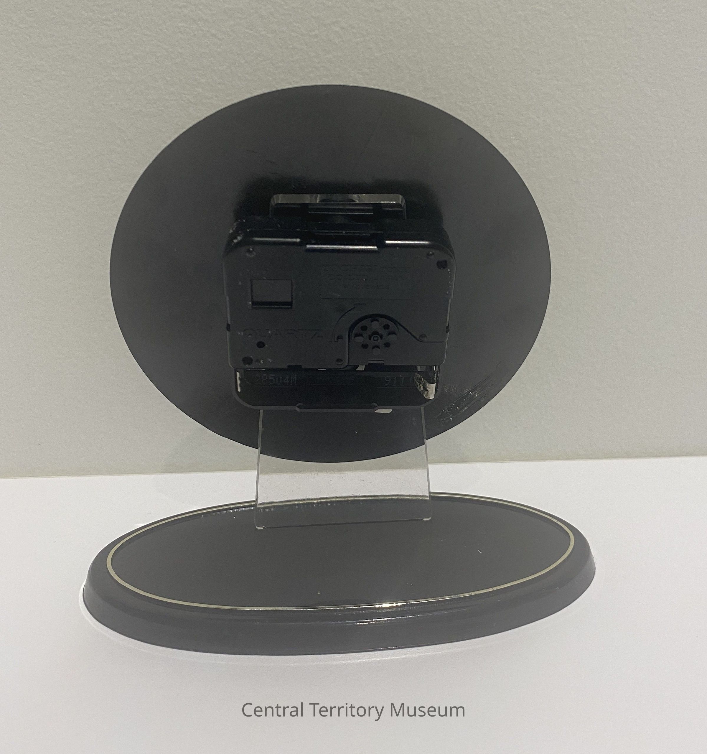 The back of the clock has a black plastic case containing the mechanism and a slot for a battery. A clear plastic tab protrudes from the case downward. A oval shaped black plastic case is included with the clock.Acquisition