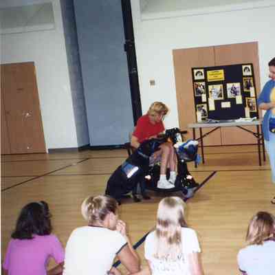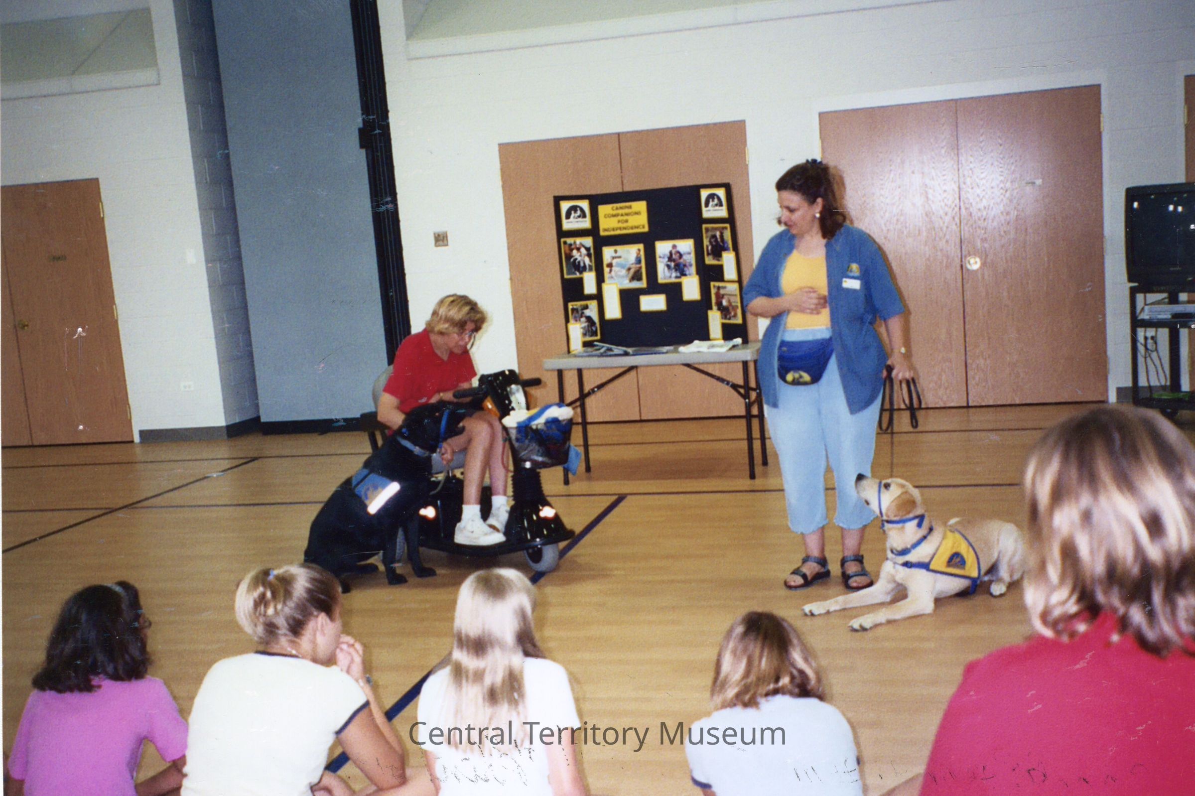 Color photo taken during a day camp hosted by the St. Charles (Tri-City), IL Corps. A group of girls, backs to the camera, watch two adult women during a presentation in the corps gymnasium. The woman on the left is seated in a motorized scooter and has a black dog with a blue service vest sitting next to her. The woman on the right is standing, holding a leash attached to a yellow dog wearing a yellow service vest. A table behind them holds a trifold poster board with photos and information.Acquisition