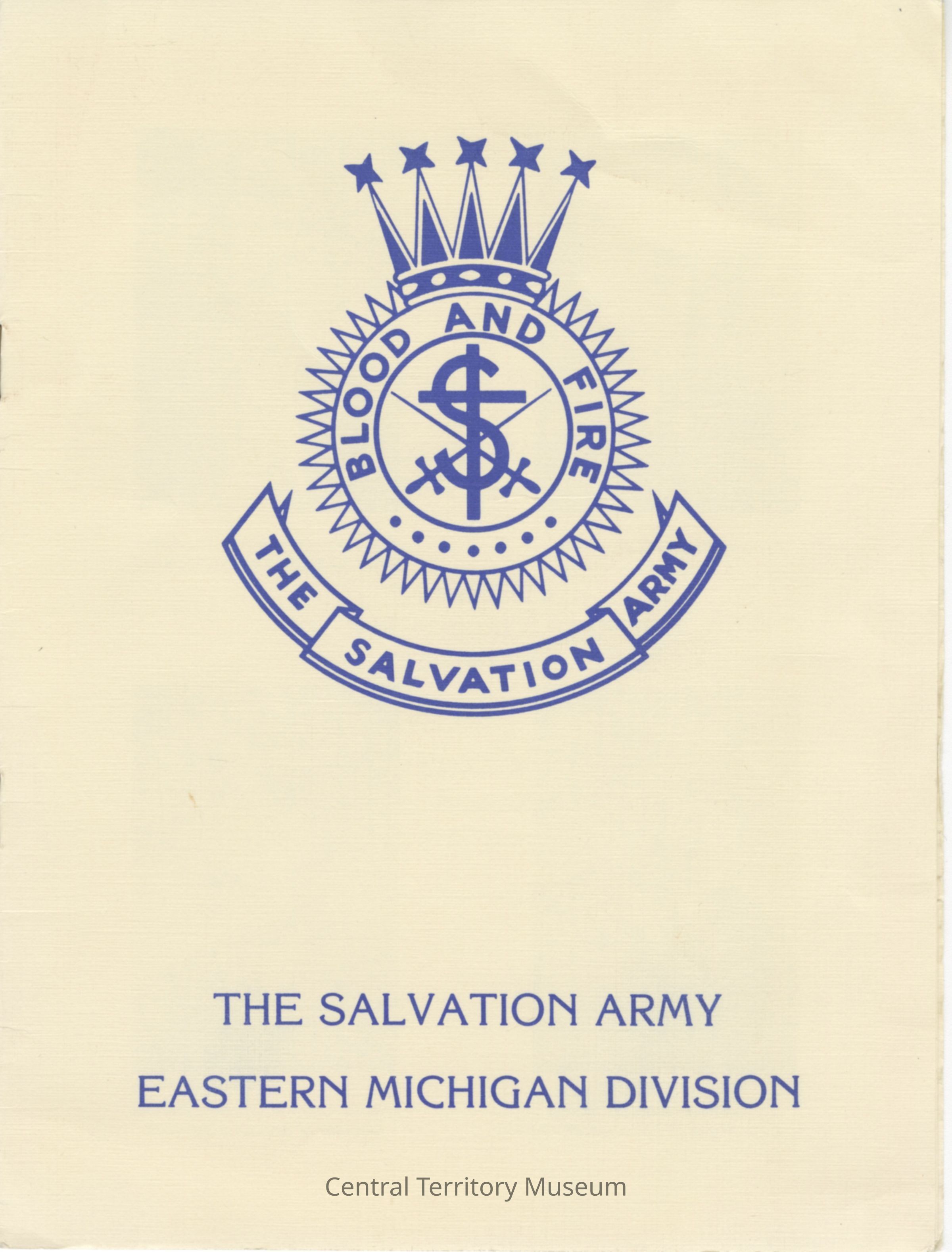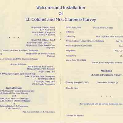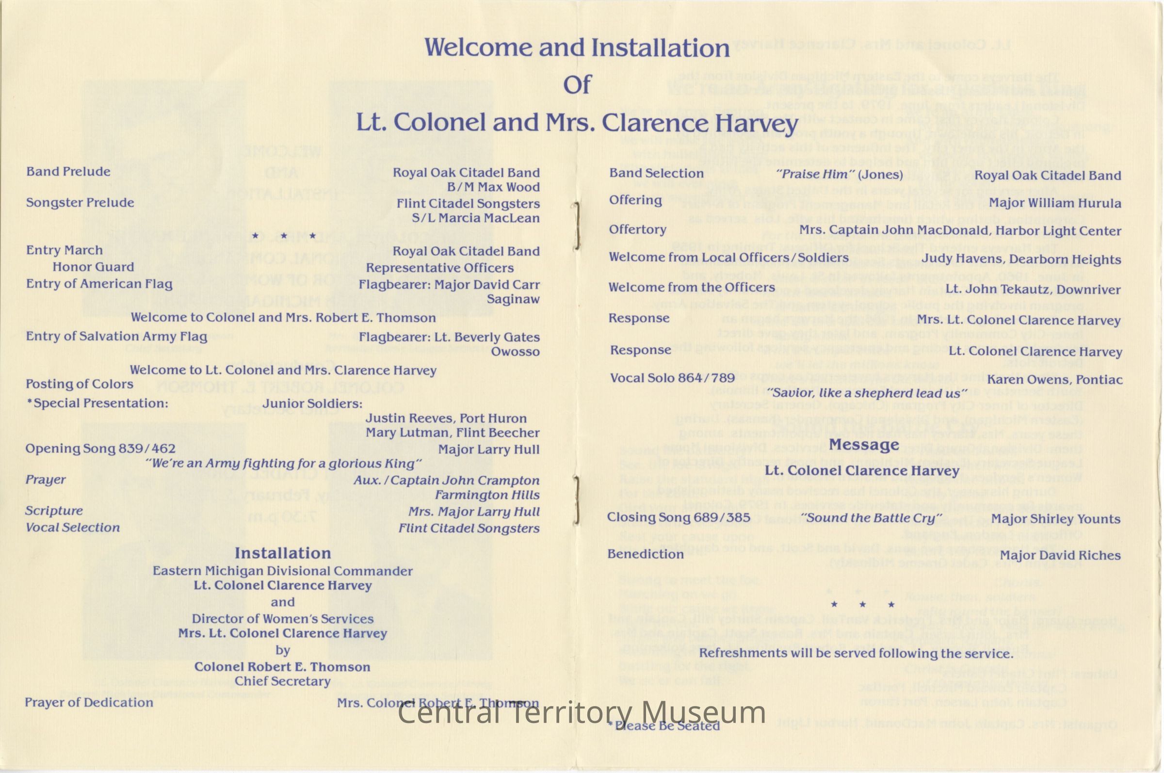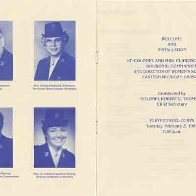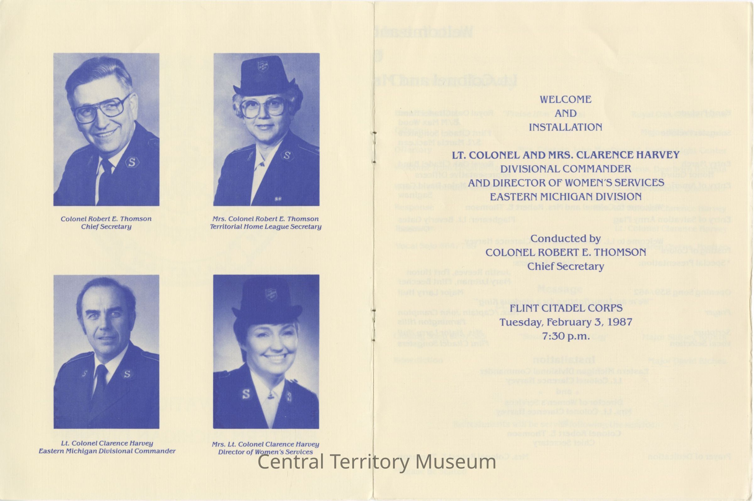 White and blue program. The cover has a Blood and Fire crest above text reading, "The Salvation Army Eastern Michigan Division." The program is for the welcome and installation of Lt. Colonel and Mrs. Clarence Harvey to be the Divisional Commander and of Women's Ministries of the Eastern Michigan Division. The event was held on February 3rd, 1987 at the Flint (Citadel), MI Corps. It was conducted by Colonel Robert E. Thomson. The program includes a brief biography of Lt. Colonel and Mrs. Clarence Harvey, songs, and photographs of officer.Acquisition