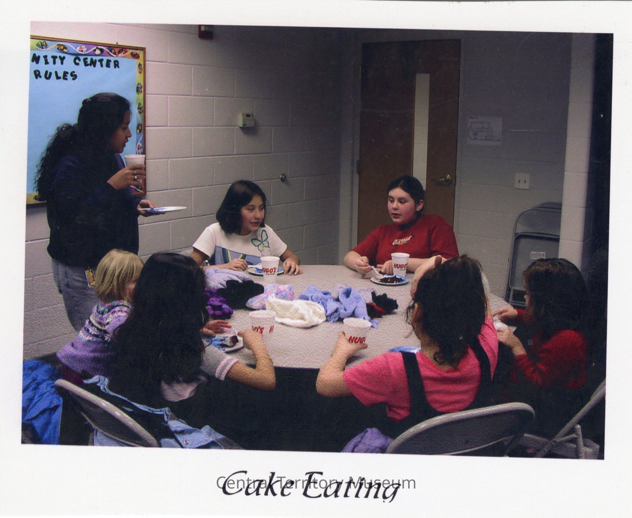 Color photo taken during a youth activity at the St. Charles (Tri-City), IL Corps. A group of girls are seated at a round table with plates of cake and drink cups in front of them. A woman is standing to the left side. The bottom border of the photo has a title, Cake Eating, printed on it in black.Acquisition