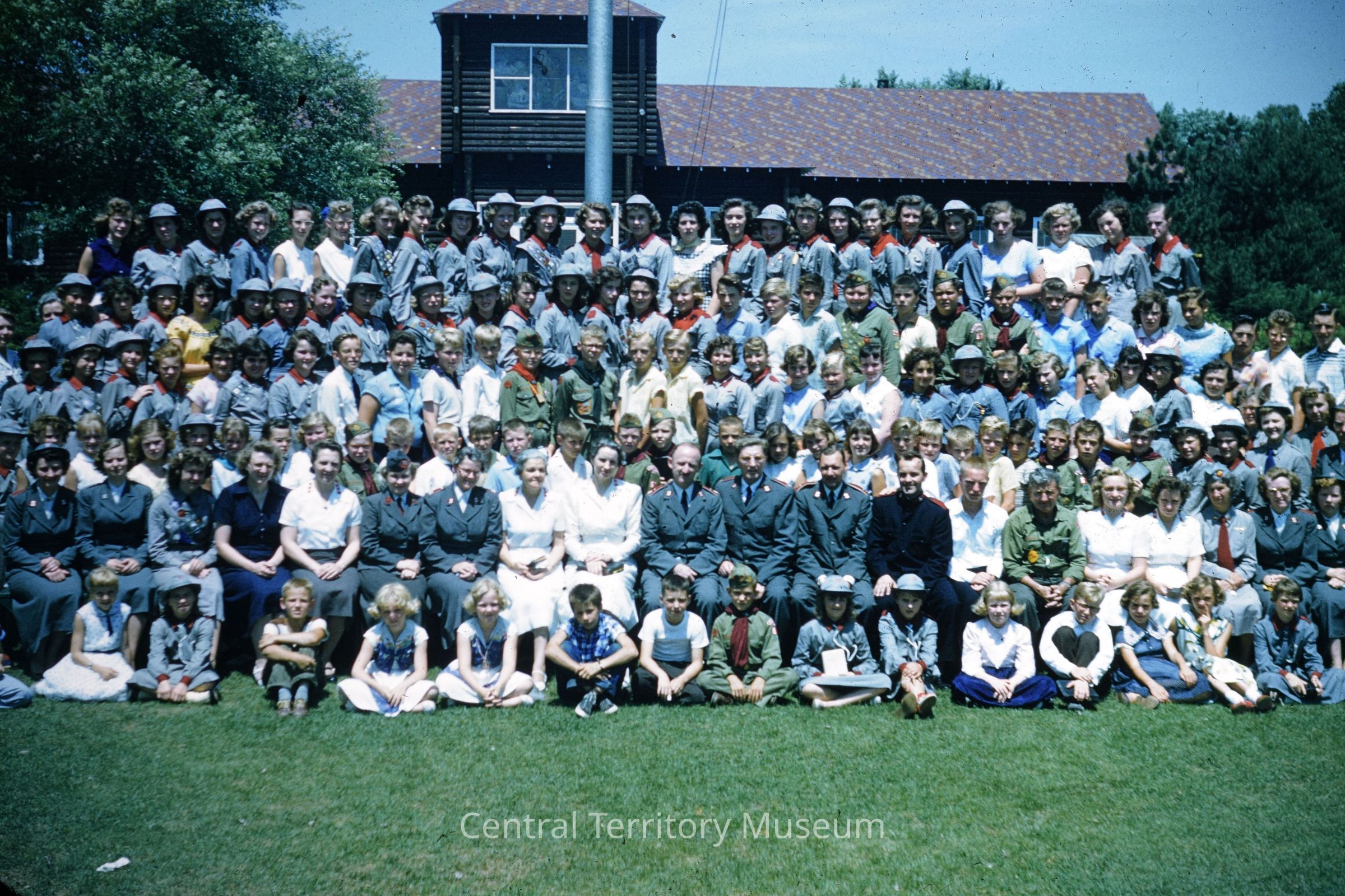 This is a group photo taken at Shagbark Camp in July 1954. The group consists of men, women, boys, and girls. The clothing ranges from the Salvation Army uniforms worn by many adults to Girl Guards uniforms to Boy Scout uniforms. There are also at least four women wearing all white uniforms that may be part of the kitchen staff at camp. The dining hall, which is a log building, is partially visible in the background as is the flag pole. Large trees flank the left and right sides of the image in the background. The slide is marked with a "9" on an orange sticker.