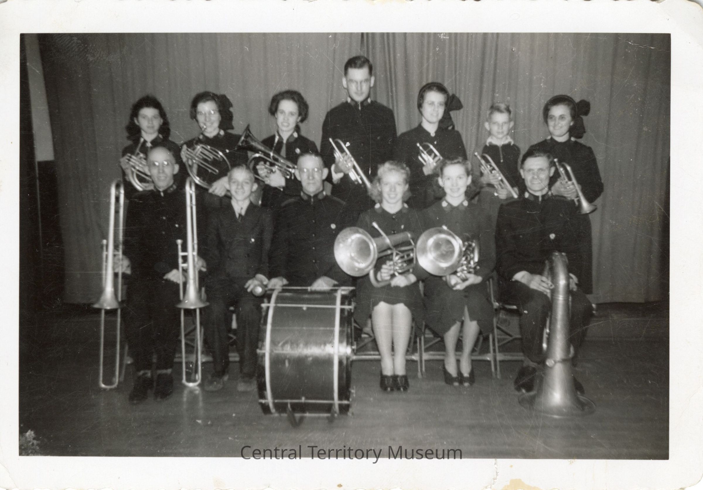 Black and white photo, 3.5" x 5", with deckle edges, of a Salvation Army corps band. Edward J. Johnson, not identified, is one of the young musicians.Acquisition