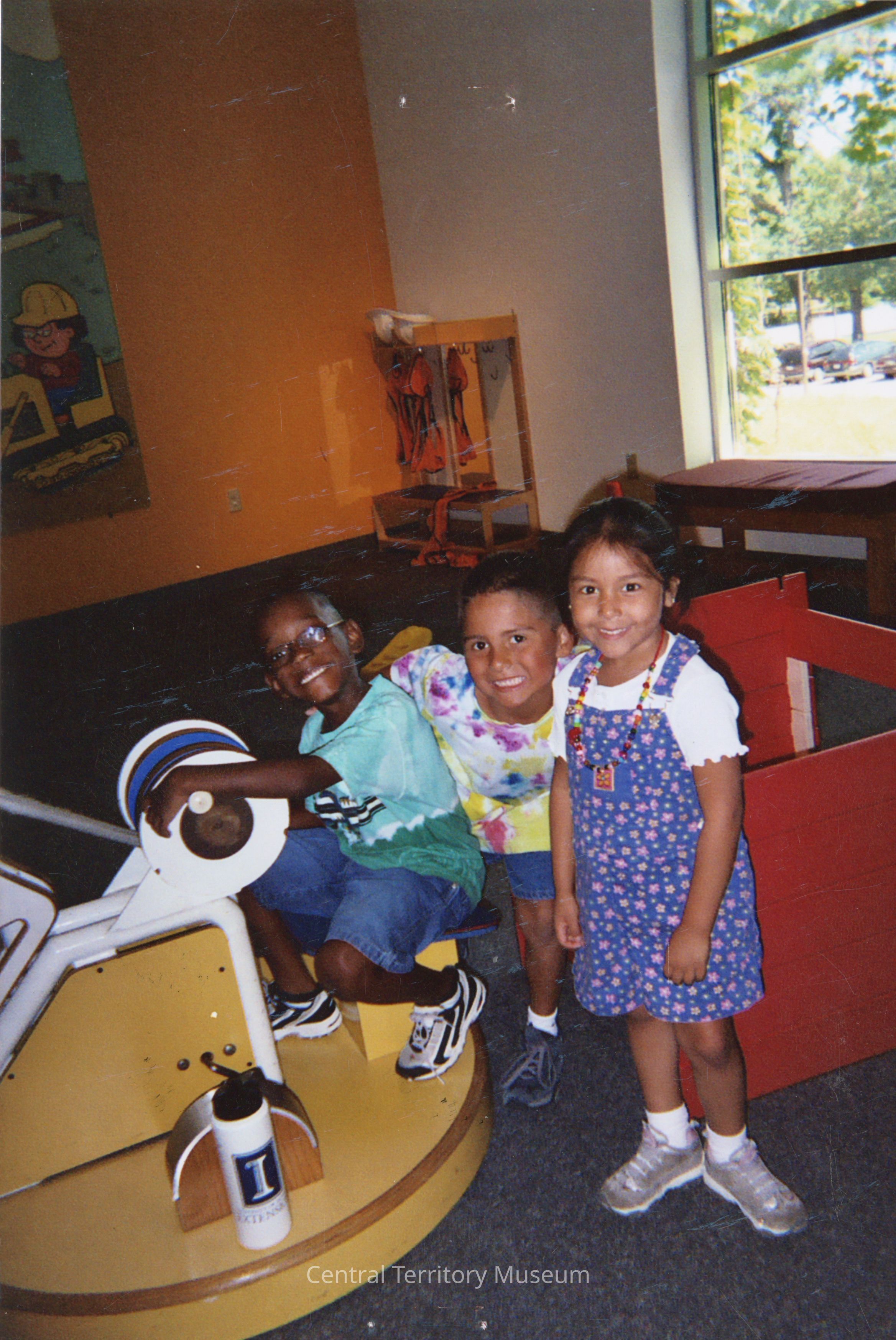 Color photo taken during a day camp hosted by the St. Charles (Tri-City), IL Corps. Three children smile for the photographer as they play inside a room. One of them, a Black boy, is sitting in front of a mock construction equipment while the other boy and the girl stand behind him. Part of an illustration can be seen on the wall behind them.