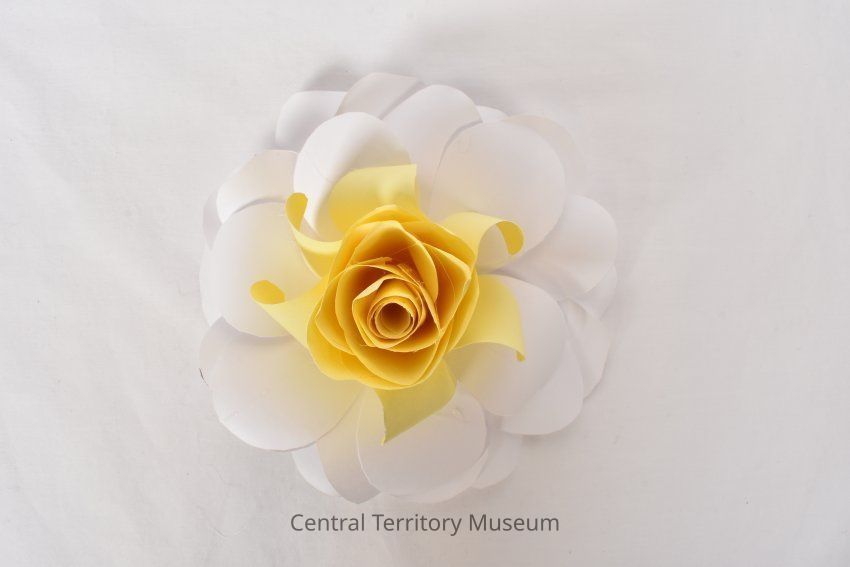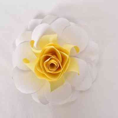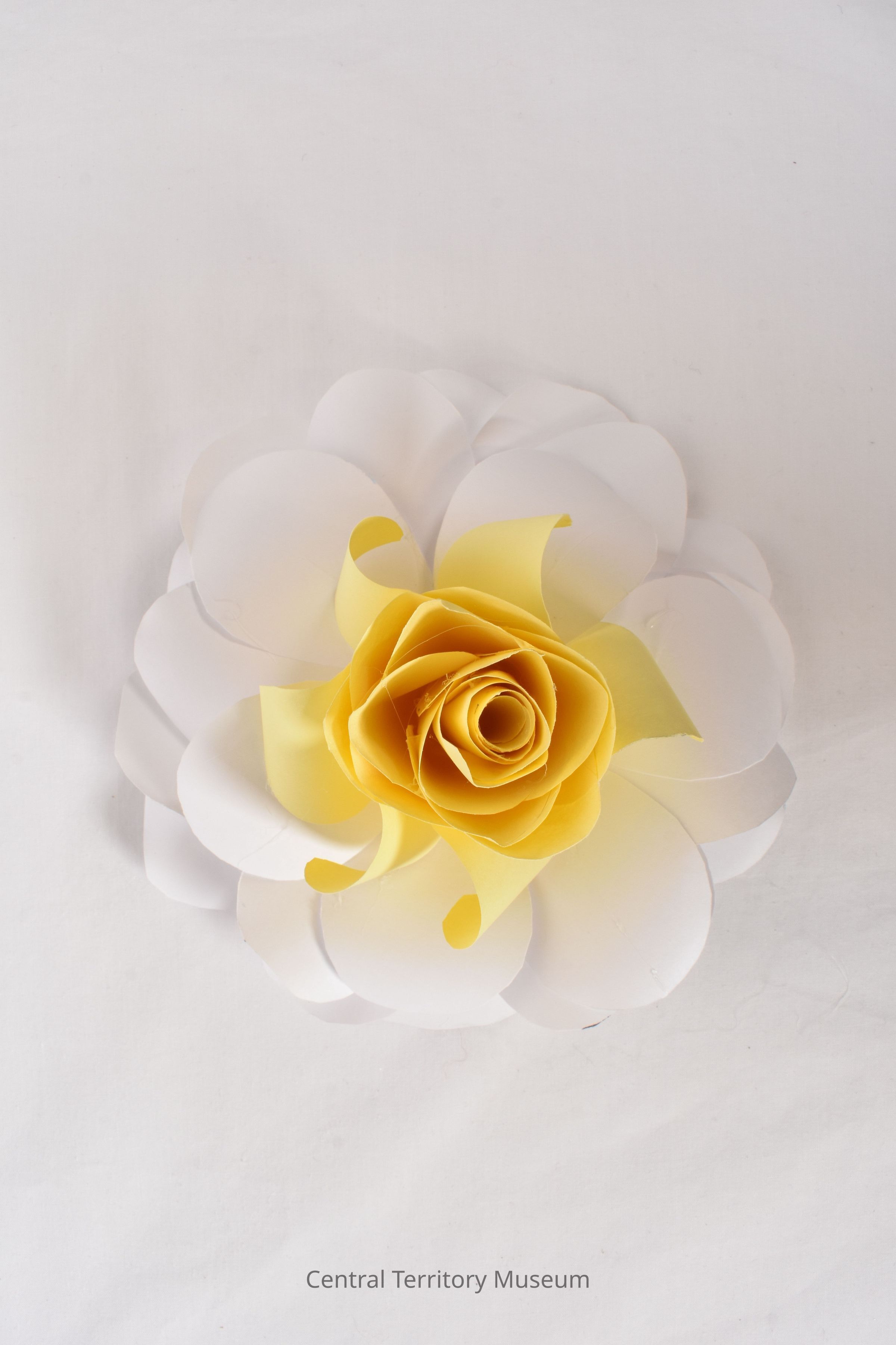 A white and yellow paper flower that resembles a rose. There are four layers of white open petals and seven layers of closed yellows petals.