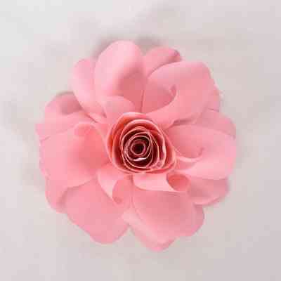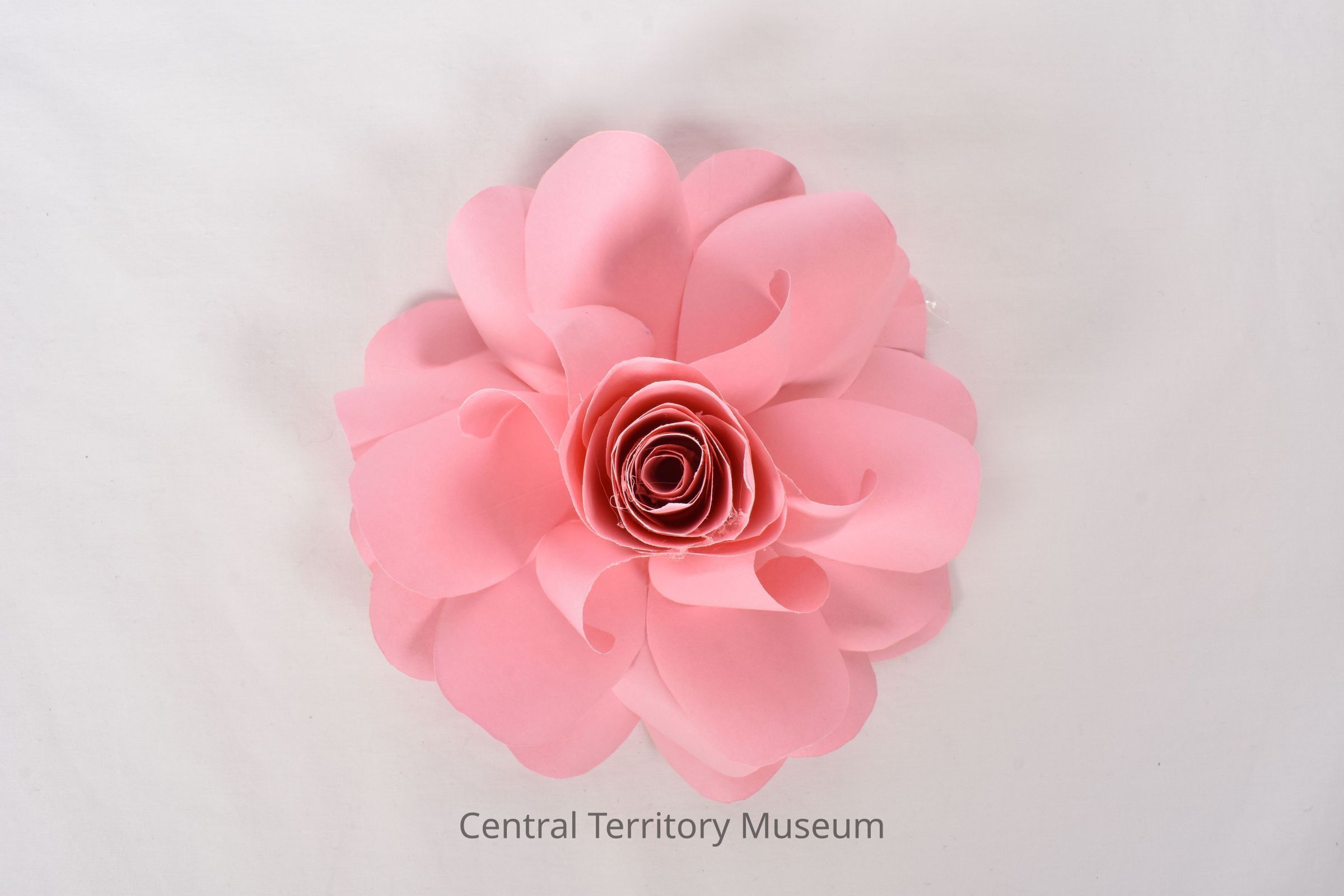 A pink paper flower that resembles a rose. There are three layers of open petals and five layers of closed petals.