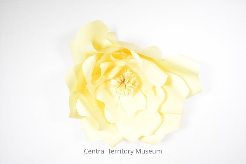 A yellow paper flower that resembles a lotus flower that features a yellow stamen center. There are four layers of petals, a round cardboard foundation supports the flowers and a yarn loop is glued to the cardboard to hang the flower.