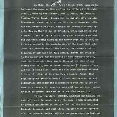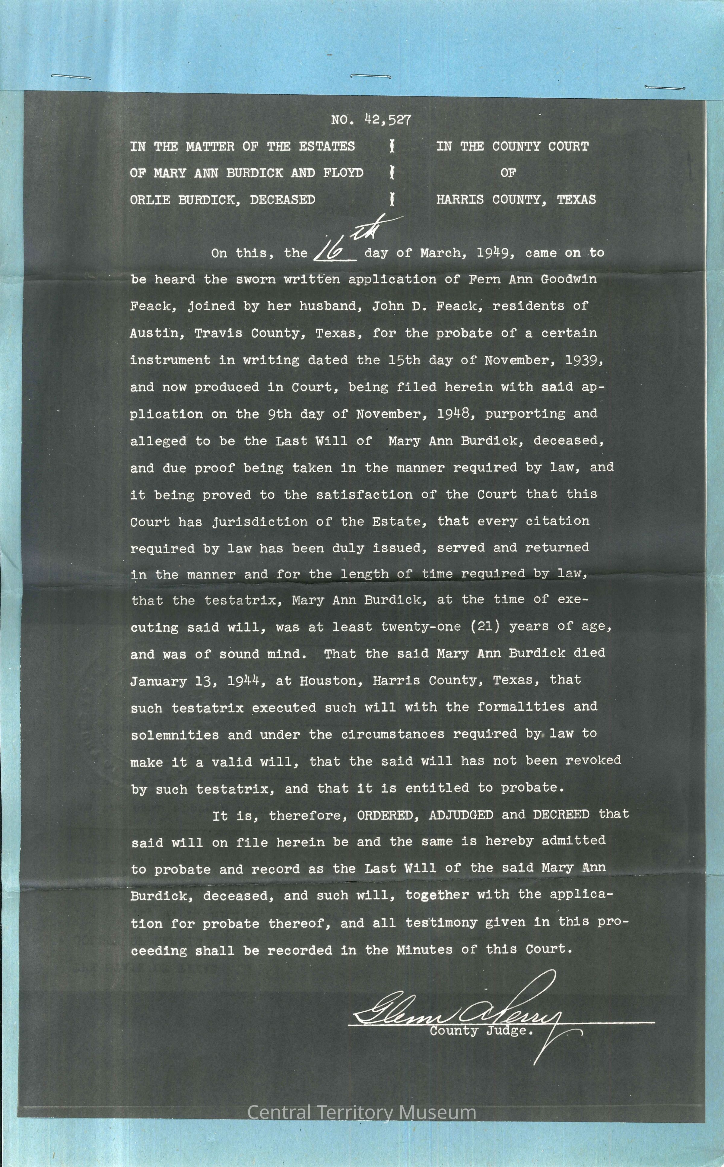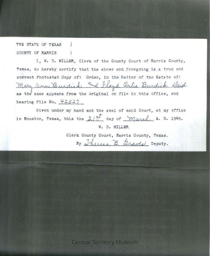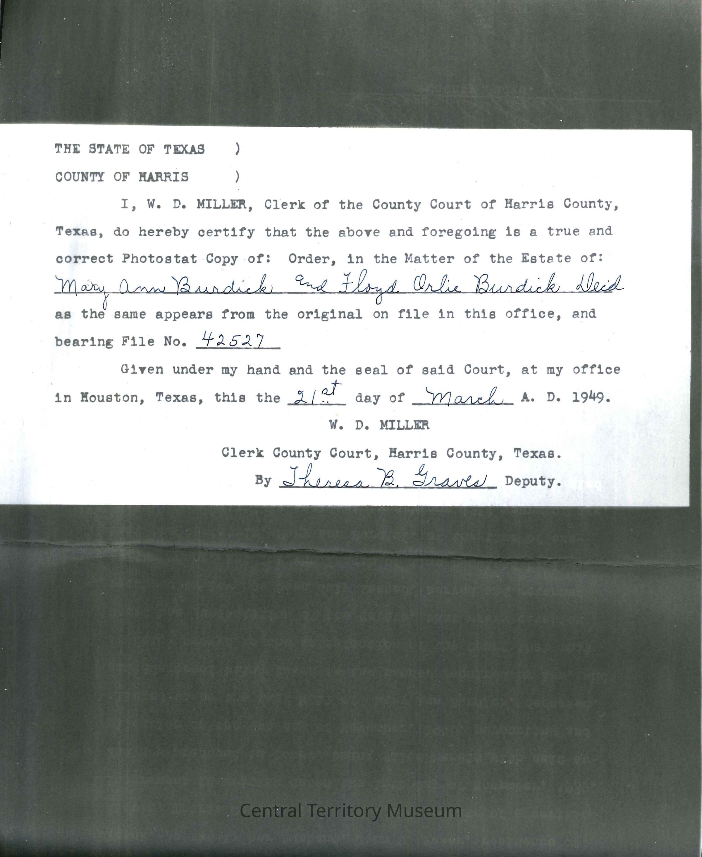 Photostat Copy of: "Order, in the Matter of the Estate of: Mary Ann Burdick and Floyd Orlie Burdick, Deceased (No. 42,527)". The original document copied decrees that the Last Will of Floyd Orlie Burdick that the county court had file is, in fact, the official Last Will of Floyd Orlie Burdick. The original document was created March 16th, 1949 and was issued and signed by the county court judge (Glenn ??erry) at the County Court of Harris County, Texas. Copied onto the obverse side of the paper is a statement declaring the photostat copy to be true and correct, dated March 21st, 1949 and signed by Clerk County Court W. D. Miller and by Deputy Theresa B. Graves.
