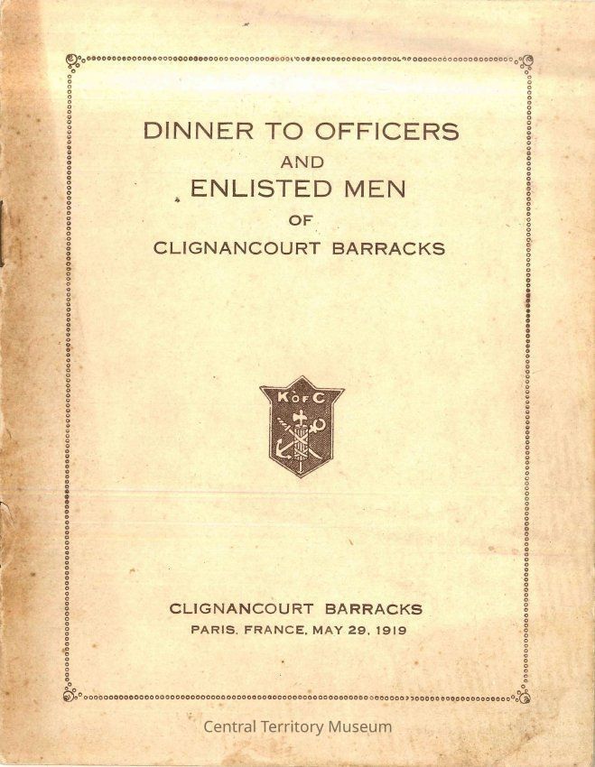 Cream/ecru paper with thicker (cardstock) paper used for the front and back cover. All text and details are printed in brown ink. Front cover has a border made of a line of small circles. There is also a logo in the shape of a shield, with the text "K OF C" above an image of a crossed sword, anchor, and axe. The event took place in the Clignancourt Barracks in Paris, France.Acquisition