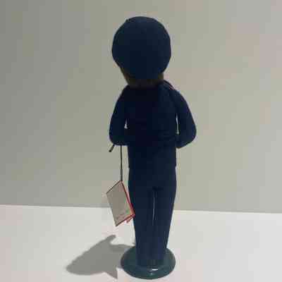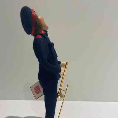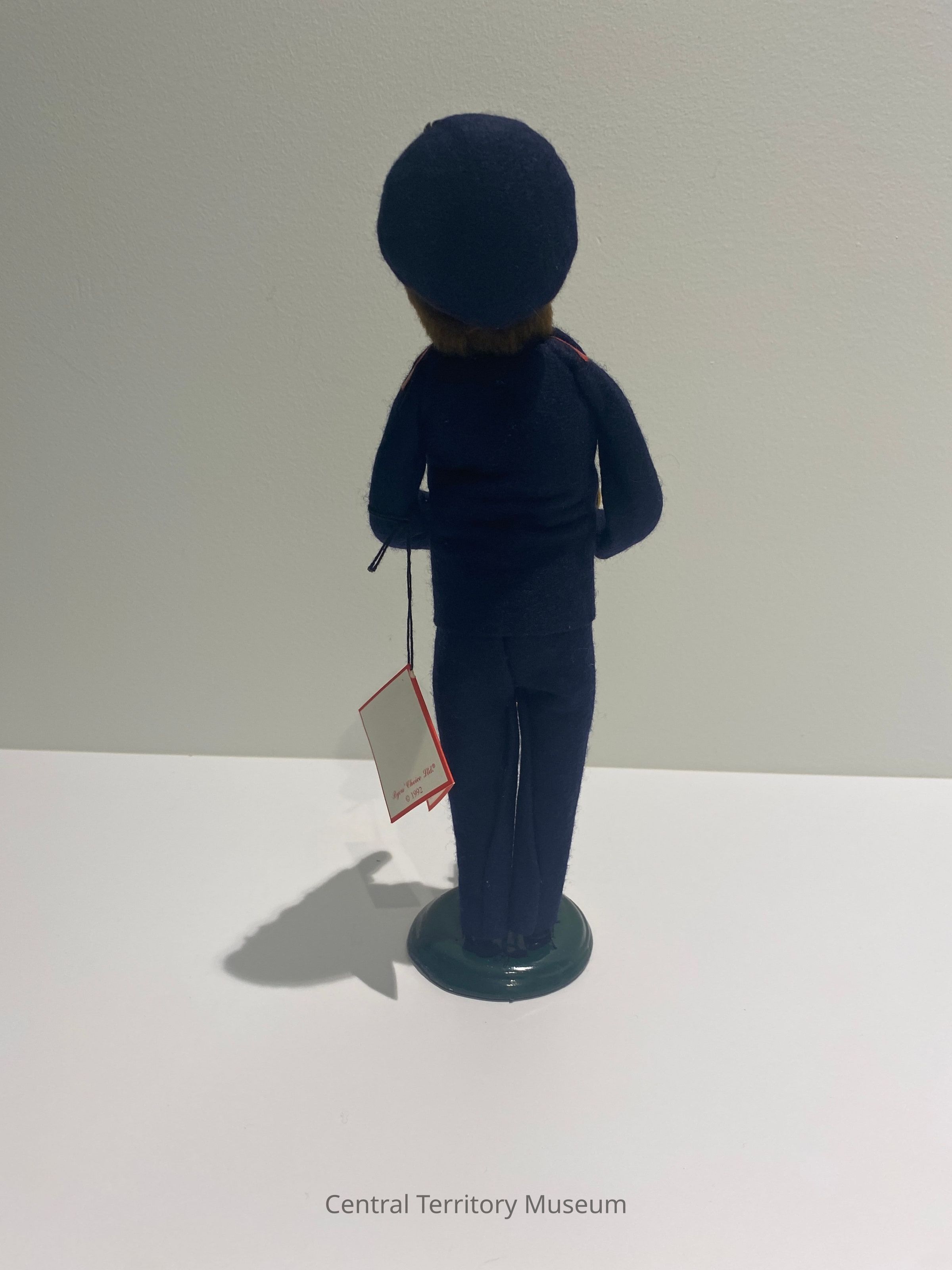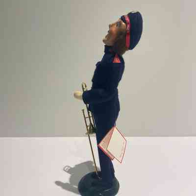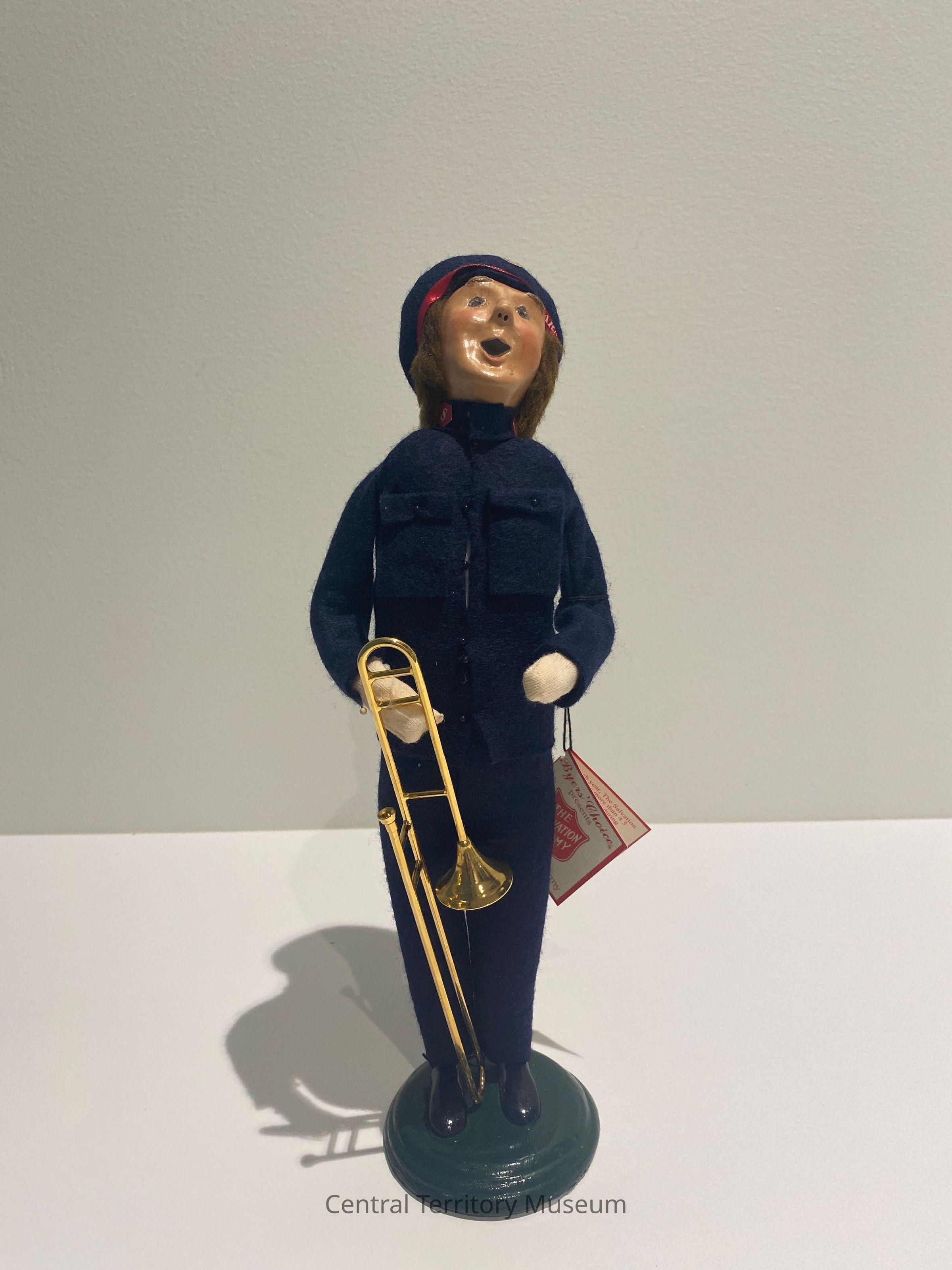 Doll. The male doll is wearing a dark blue Salvation Army uniform with red trim on the shoulders and collar and black shoes. He is wearing a dark blue cap with red trim imprinted in white The Salvation Army and light brown hair flanks either side of his face. The man is holding a gold trombone in his right hand and has his mouth open as if he is singing. The doll is attached to a dark green circular wood base.