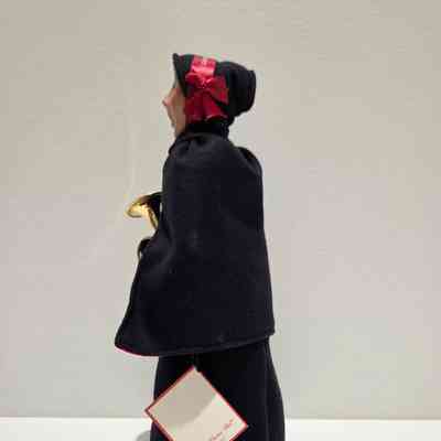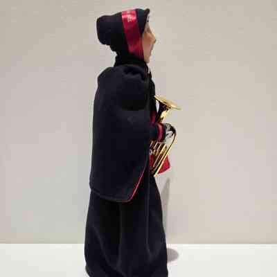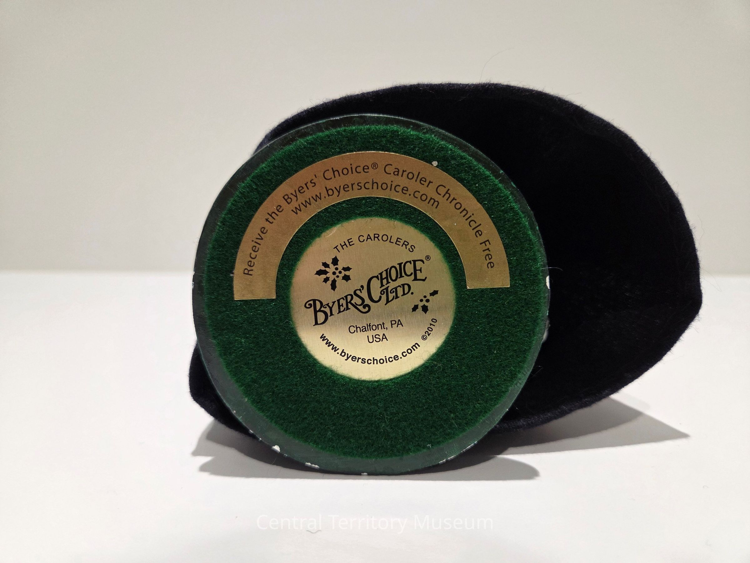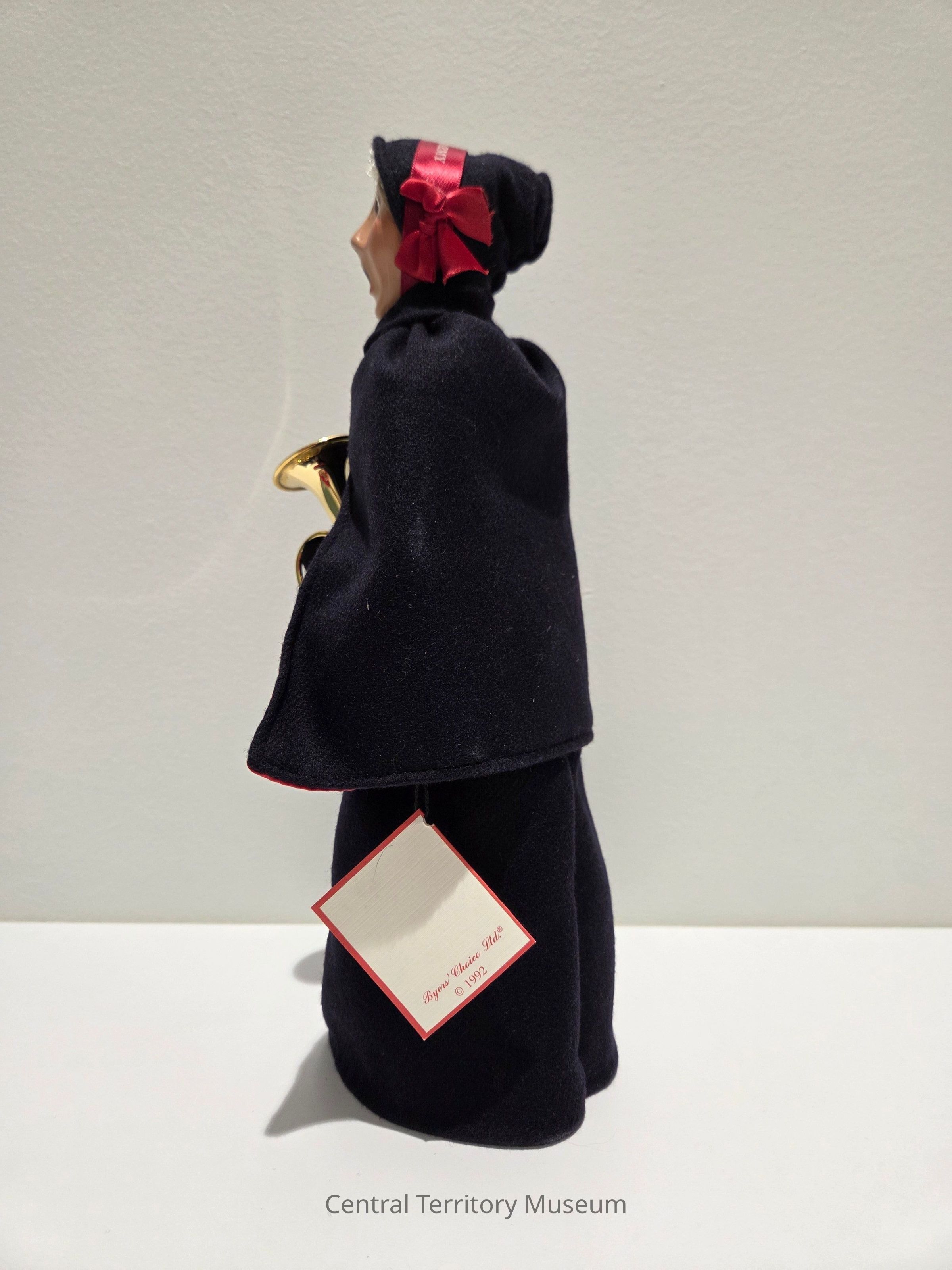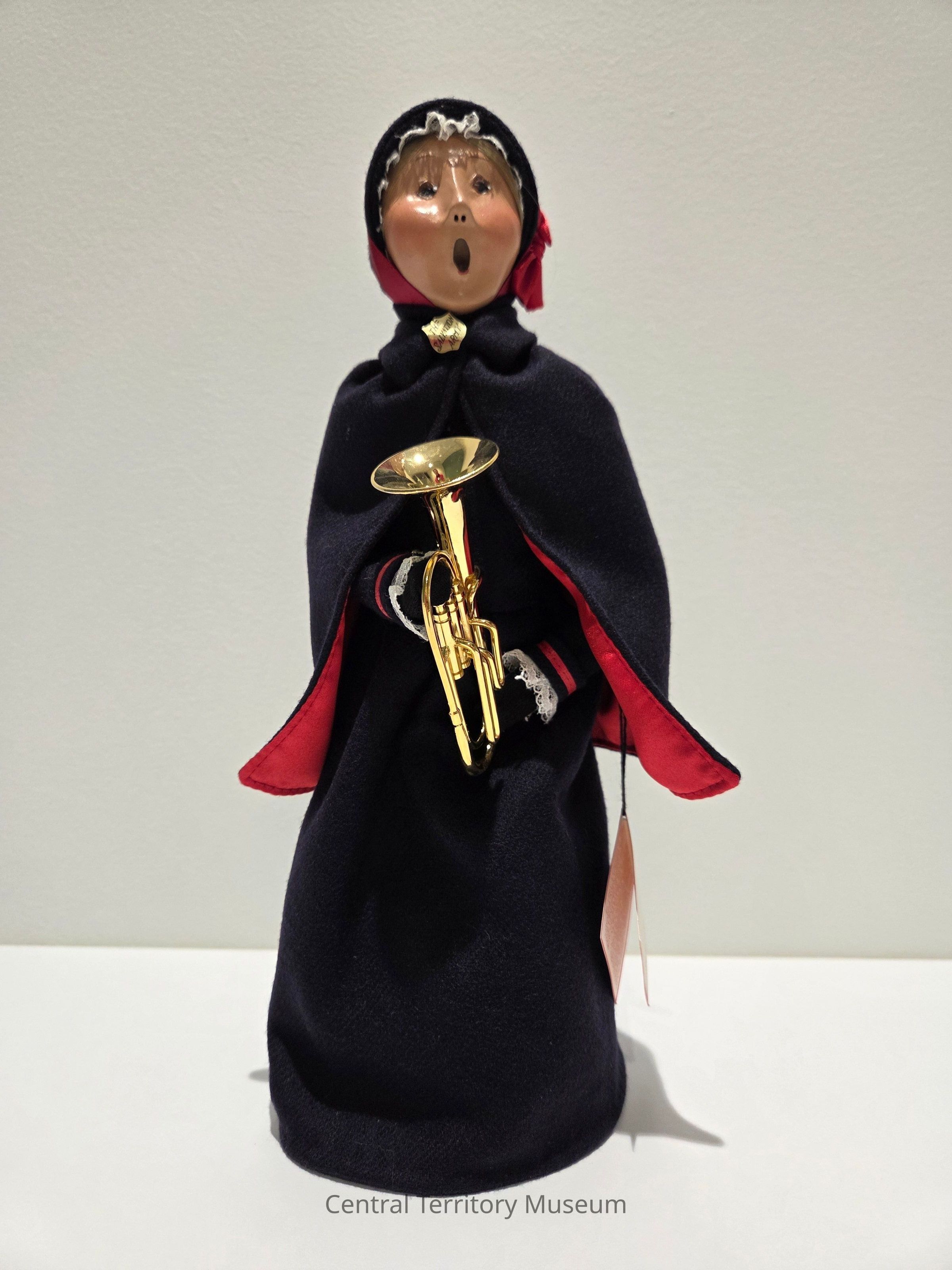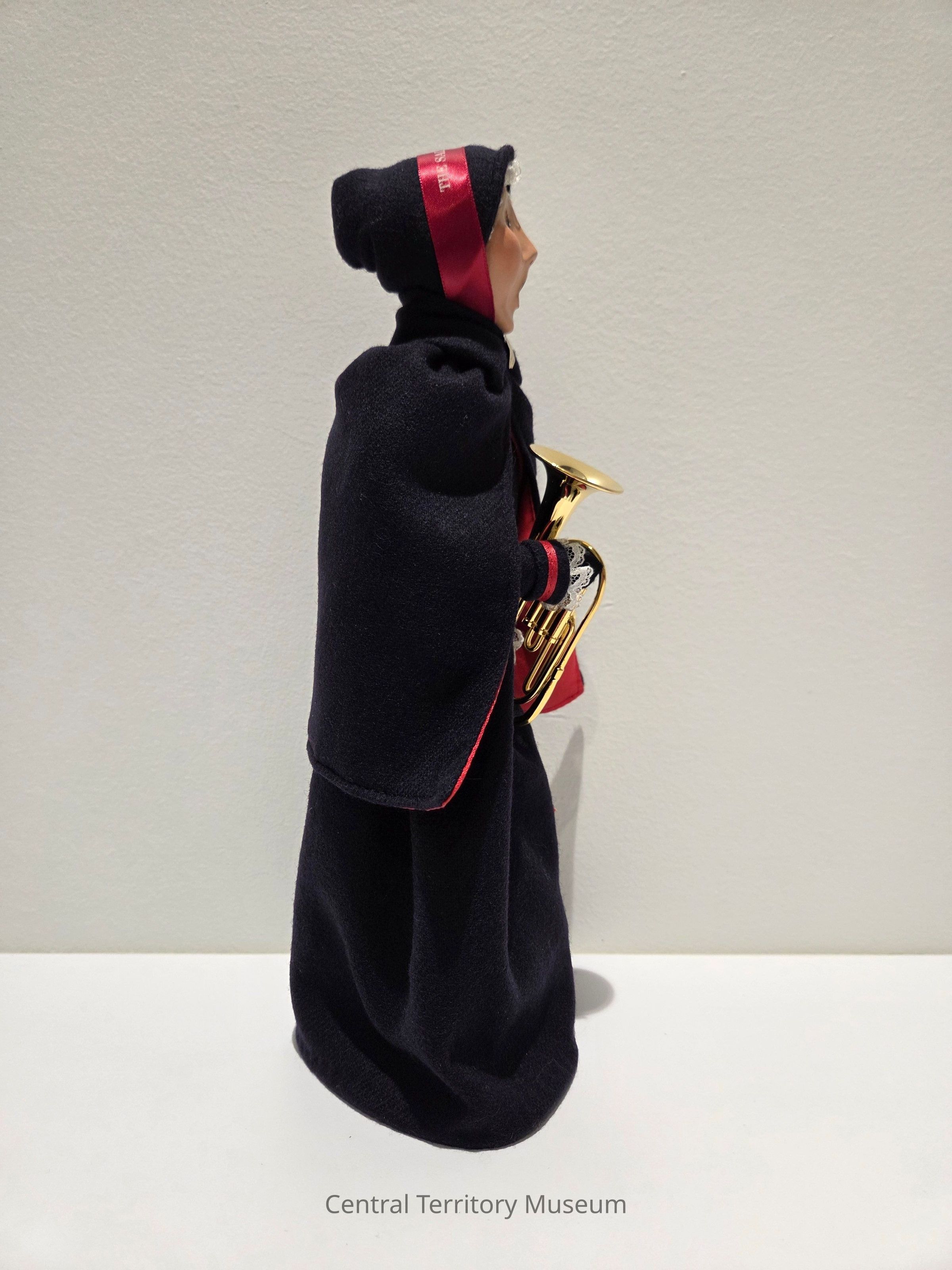 Doll. Female doll wearing a dark blue dress, a dark blue cape with a red satin lining and a dark blue bonnet. The bonnet has a red ribbon imprinted with white text The Salvation Army and is tied into a bow on the left side. She has lace trim on the cuffs and on the edge of the bonnet. Her mouth is open as if she is singing. A gold metal Salvation Army shield pin is at the throat of the cape. She is holding a gold French horn in her mittened hands, in an upright position with the valves nearest her hands. The doll is attached to a dark green wood base.