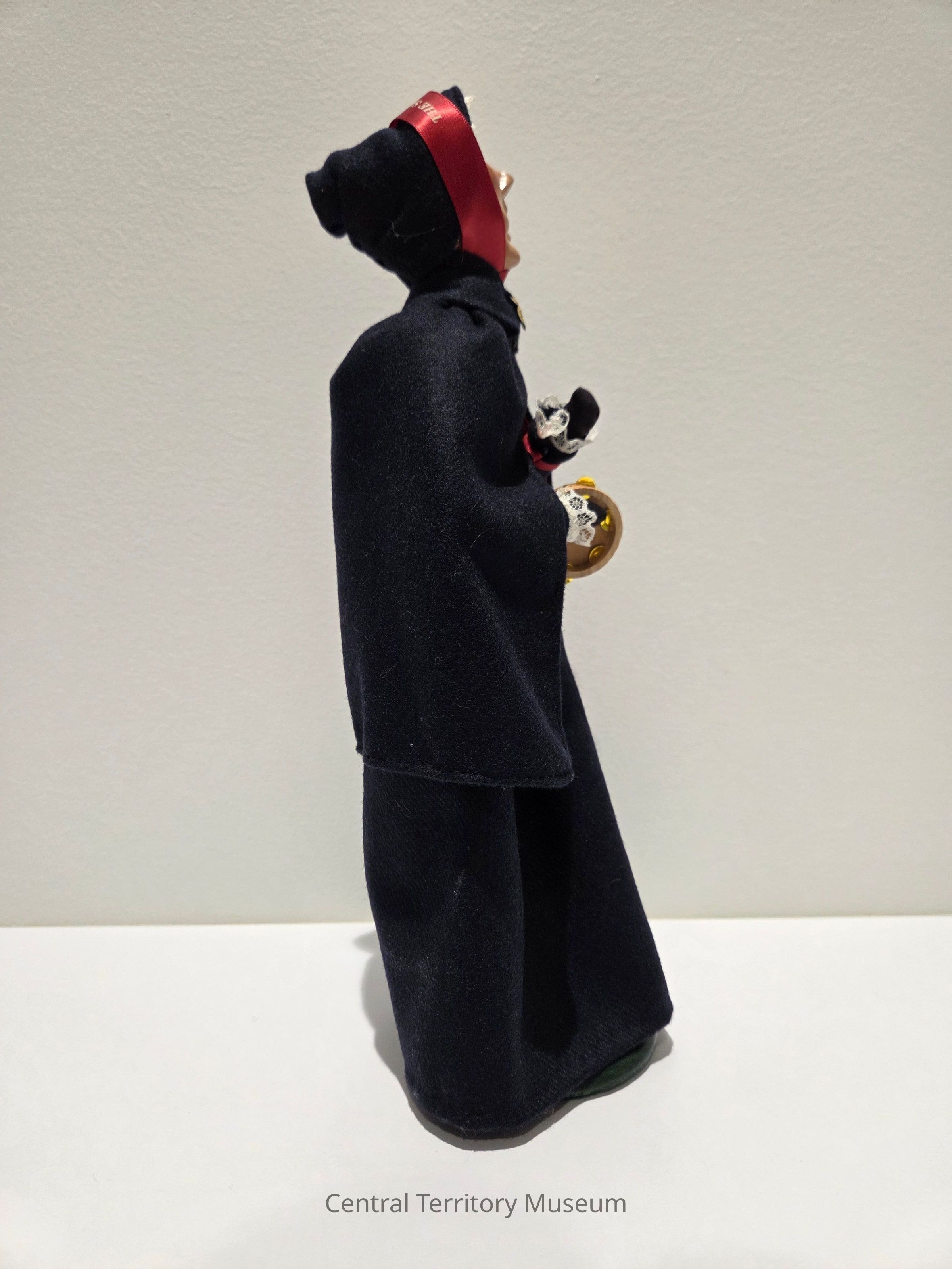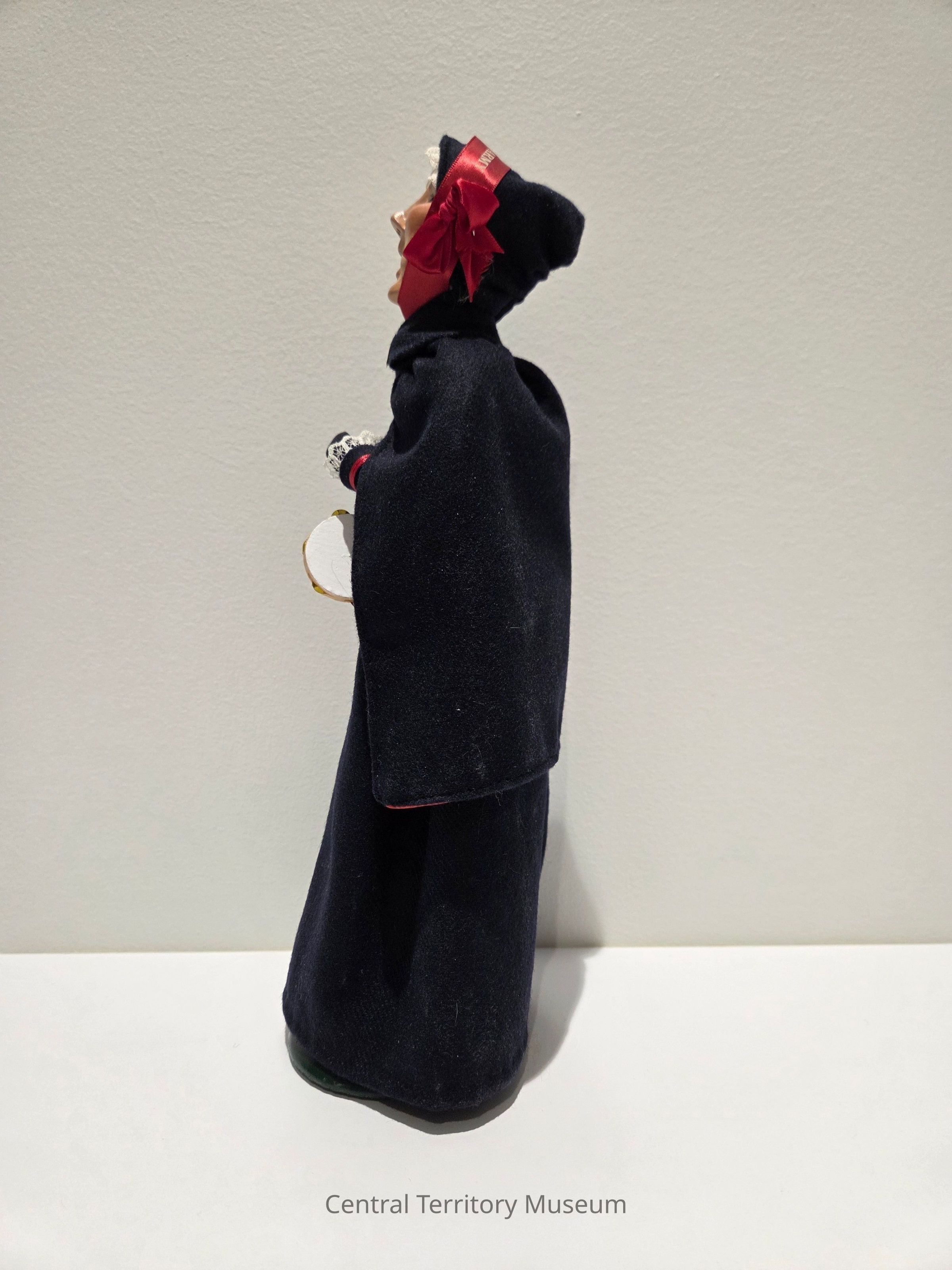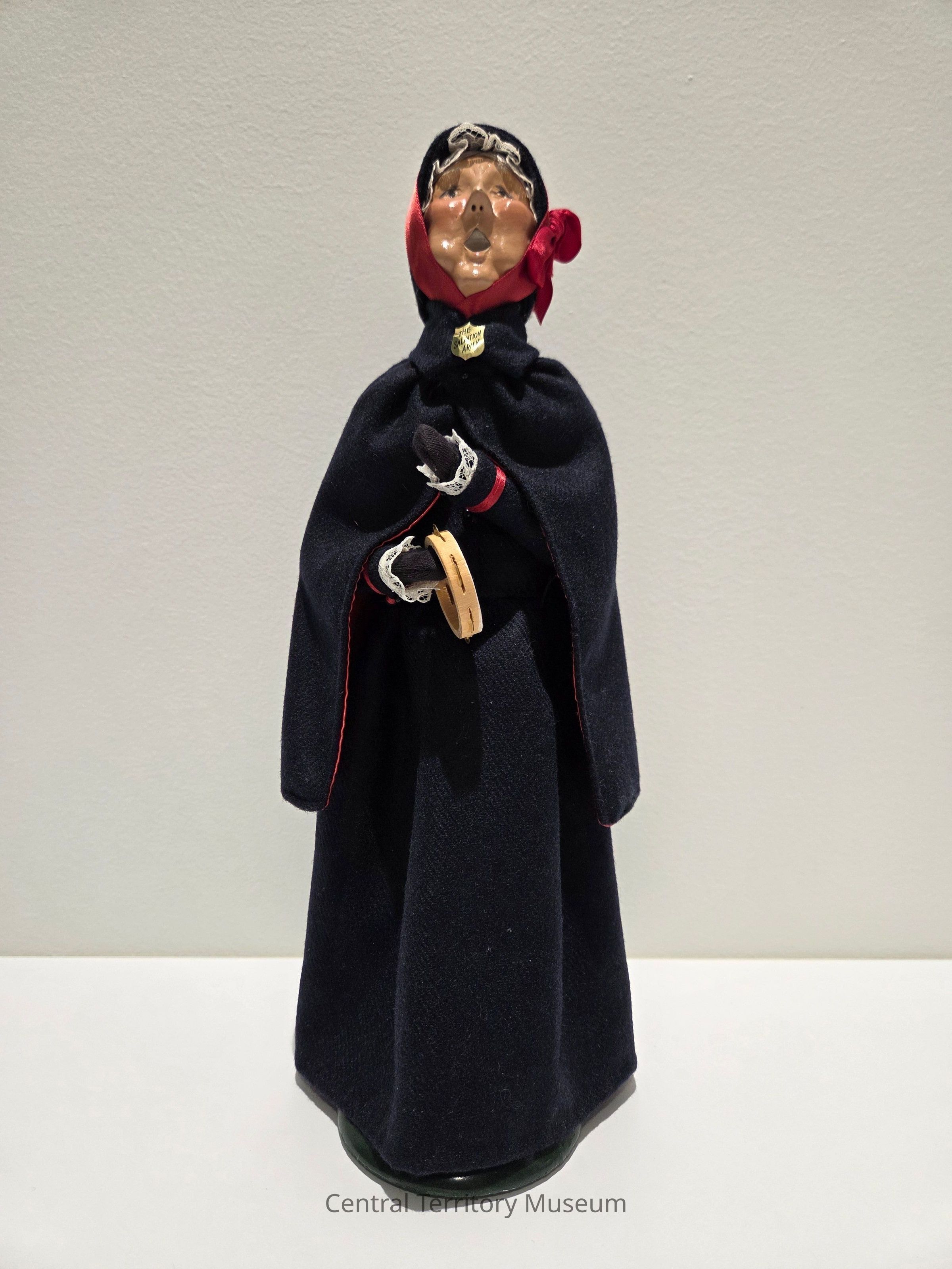 Doll. Female doll, dressed in a dark blue Salvation Army dress, a dark blue cape with a red lining, and a dark blue bonnet. The bonnet is trimmed with a red ribbon, imprinted in white The Salvation Army. Red ribbon trim encircles her arms just above the wrist. Lace trim is attached to the edge of the bonnet and to her cuffs. Her mouth is open, as if she is singing. Black mitts cover her hands and she is holding a tambourine (timbrel) in both hands.Acquisition