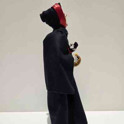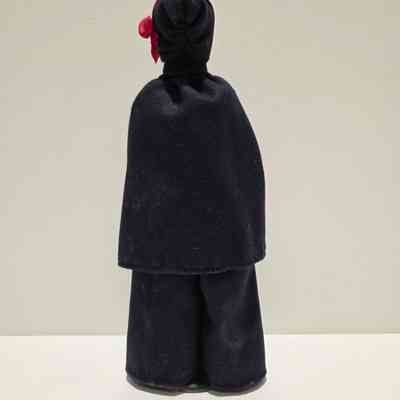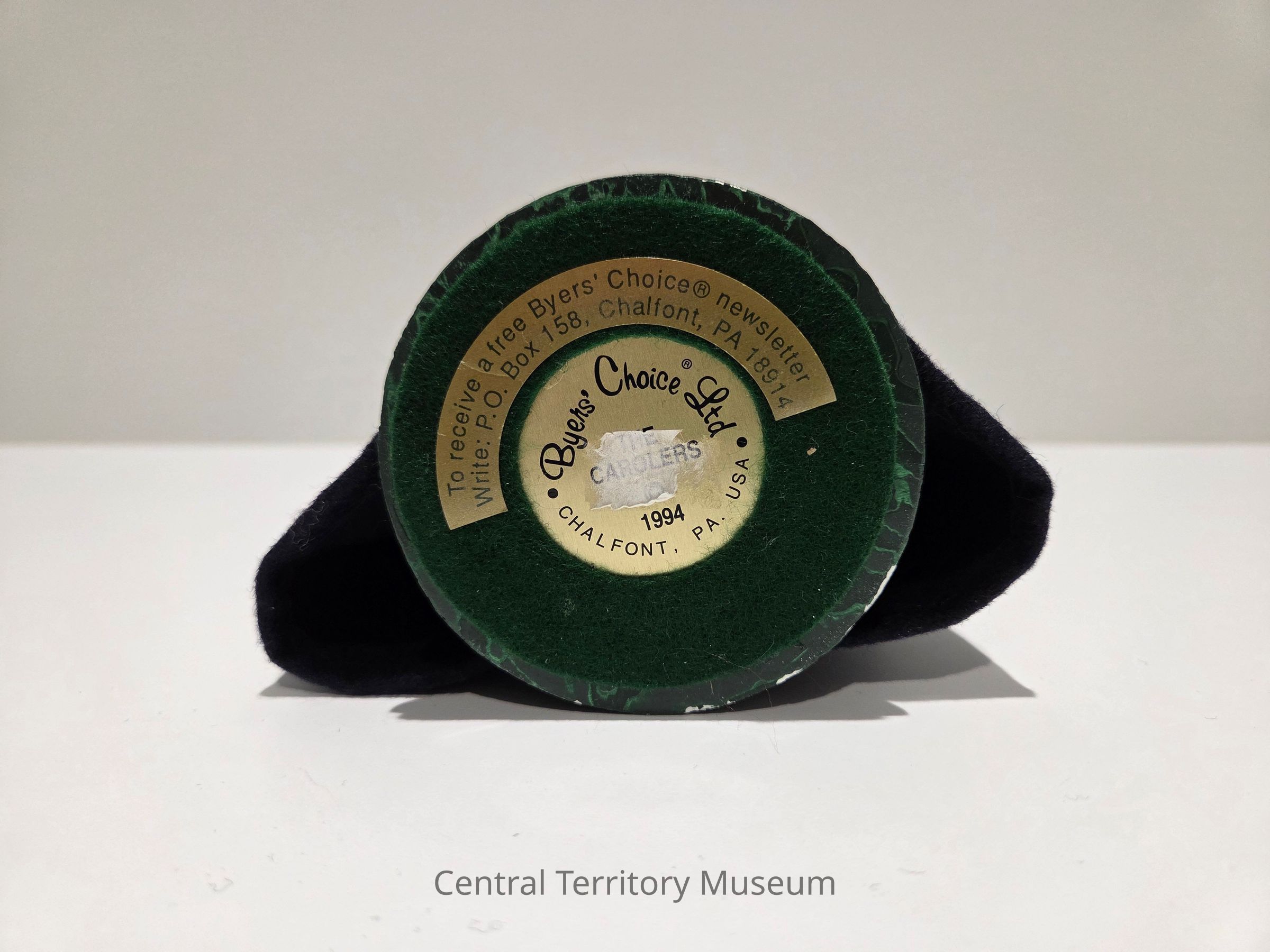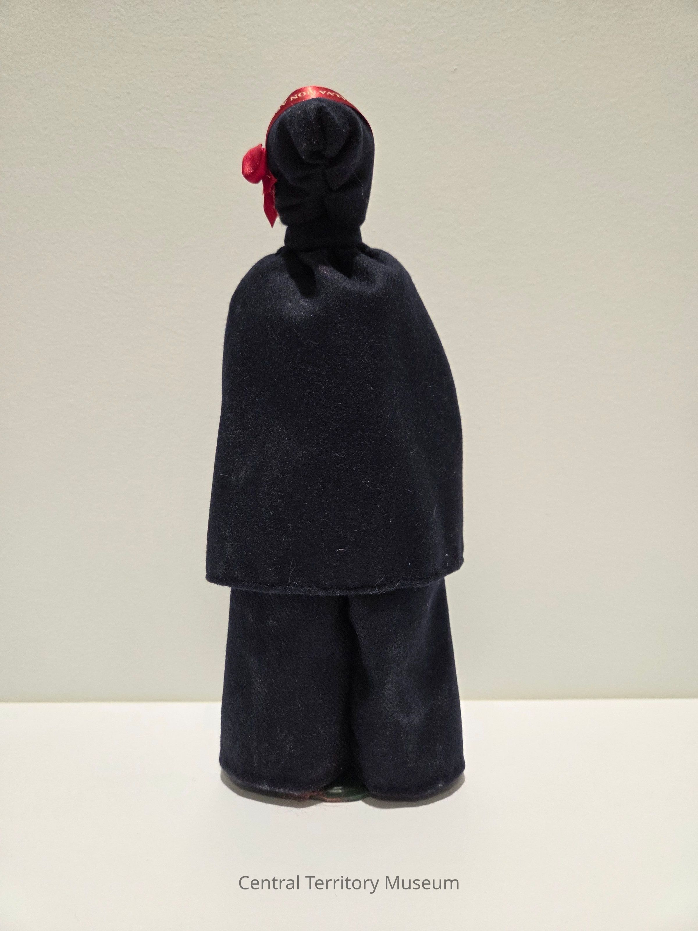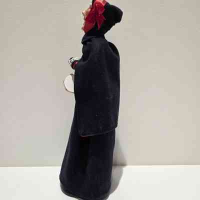 Doll. Female doll, dressed in a dark blue Salvation Army dress, a dark blue cape with a red lining, and a dark blue bonnet. The bonnet is trimmed with a red ribbon, imprinted in white The Salvation Army. Red ribbon trim encircles her arms just above the wrist. Lace trim is attached to the edge of the bonnet and to her cuffs. Her mouth is open, as if she is singing. Black mitts cover her hands and she is holding a tambourine (timbrel) in both hands.Acquisition