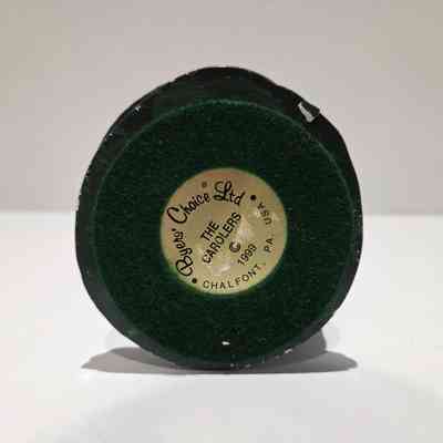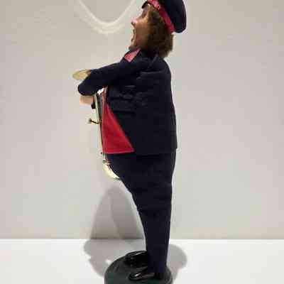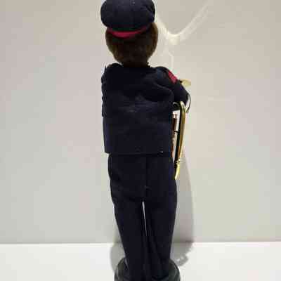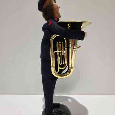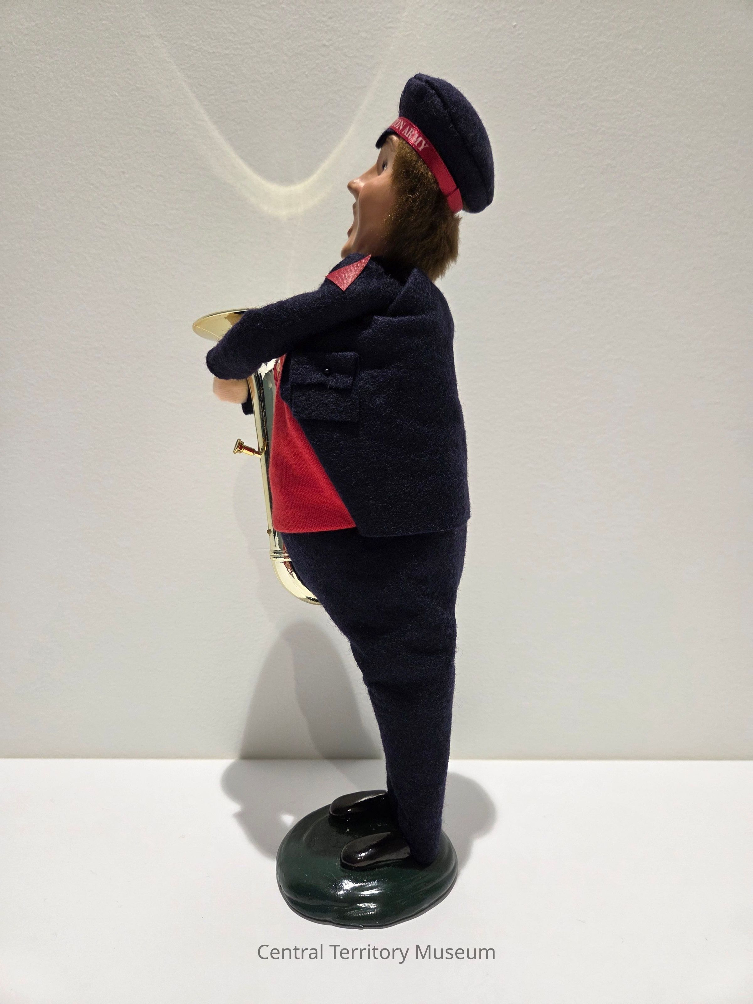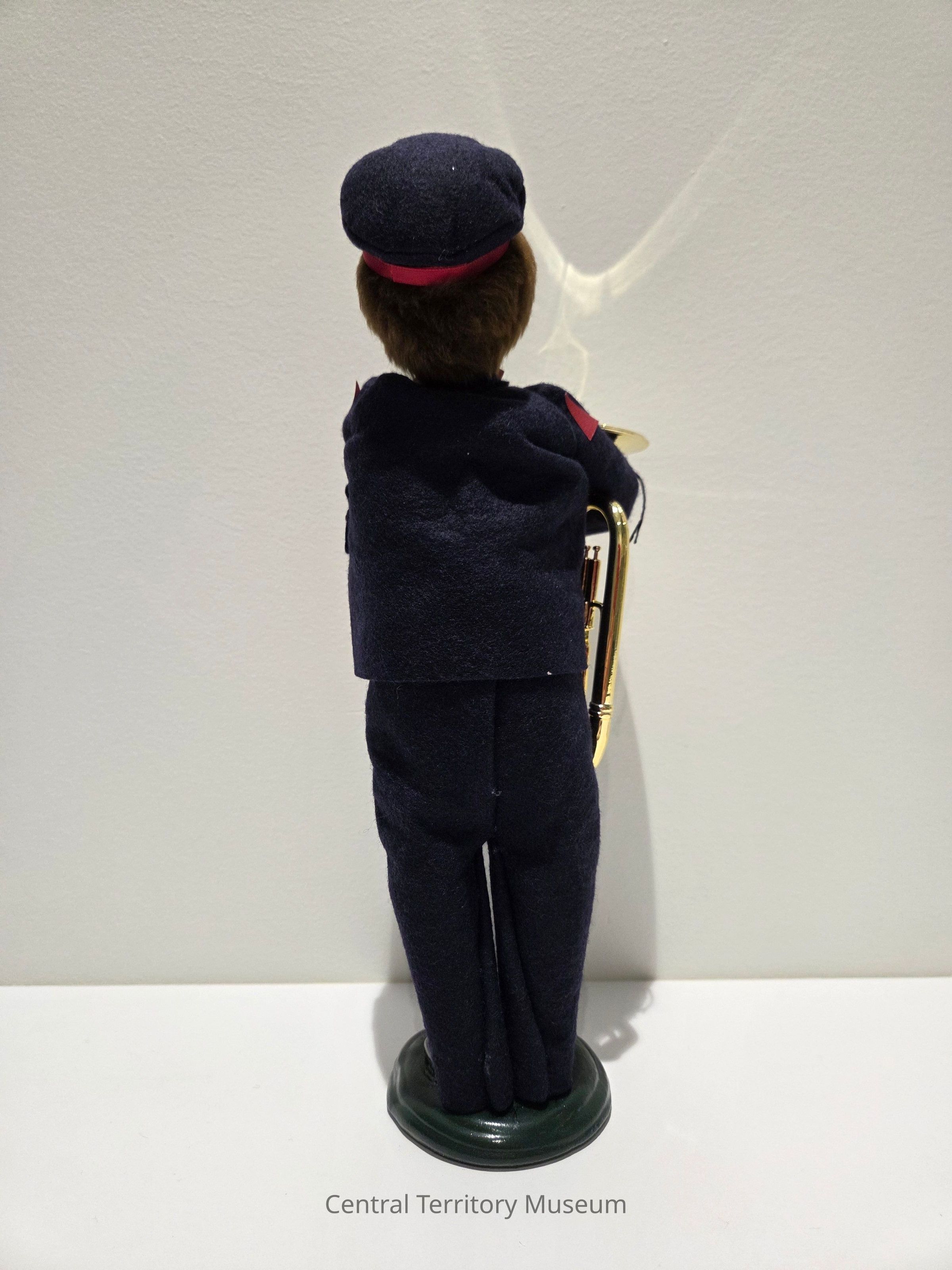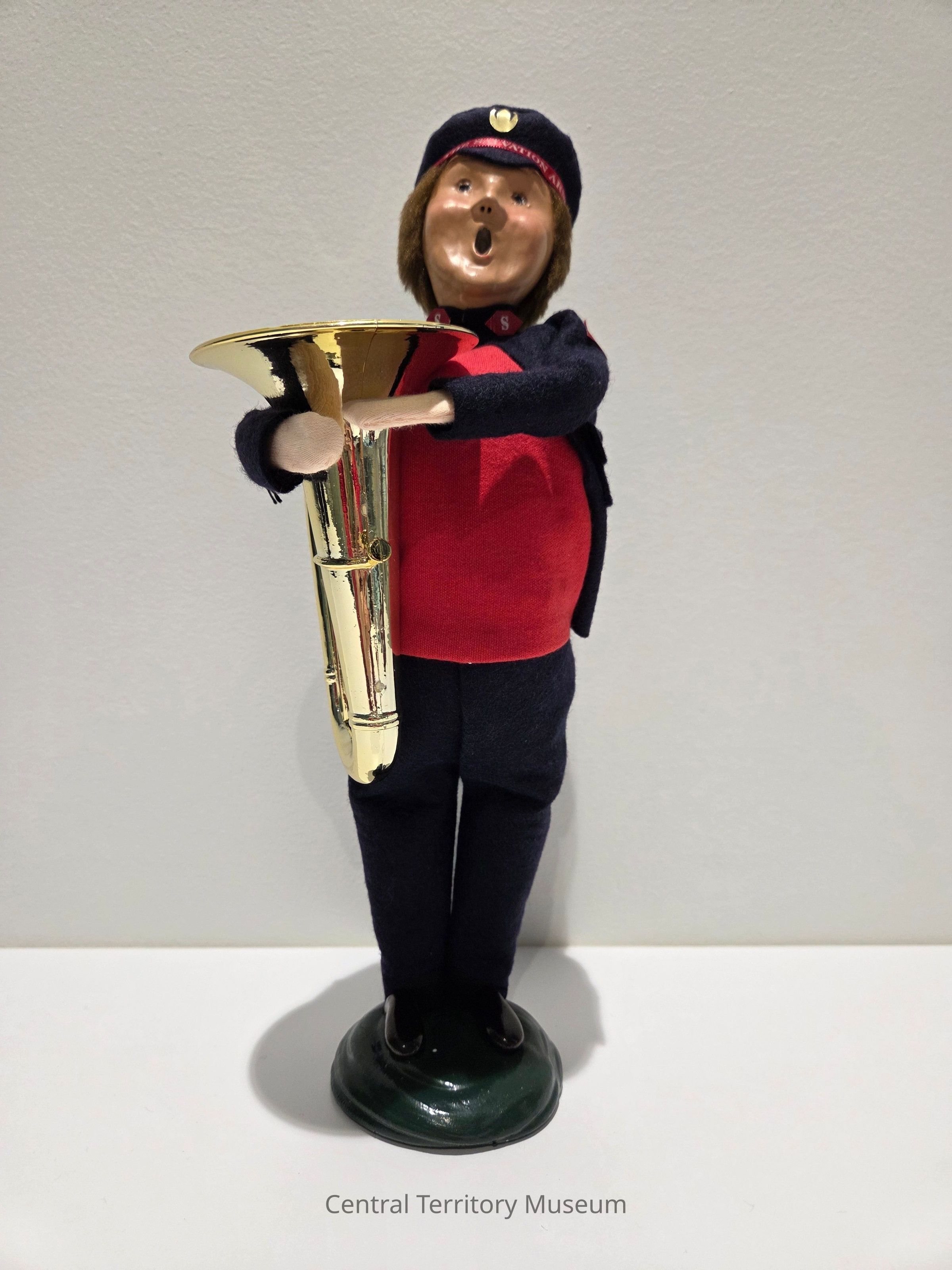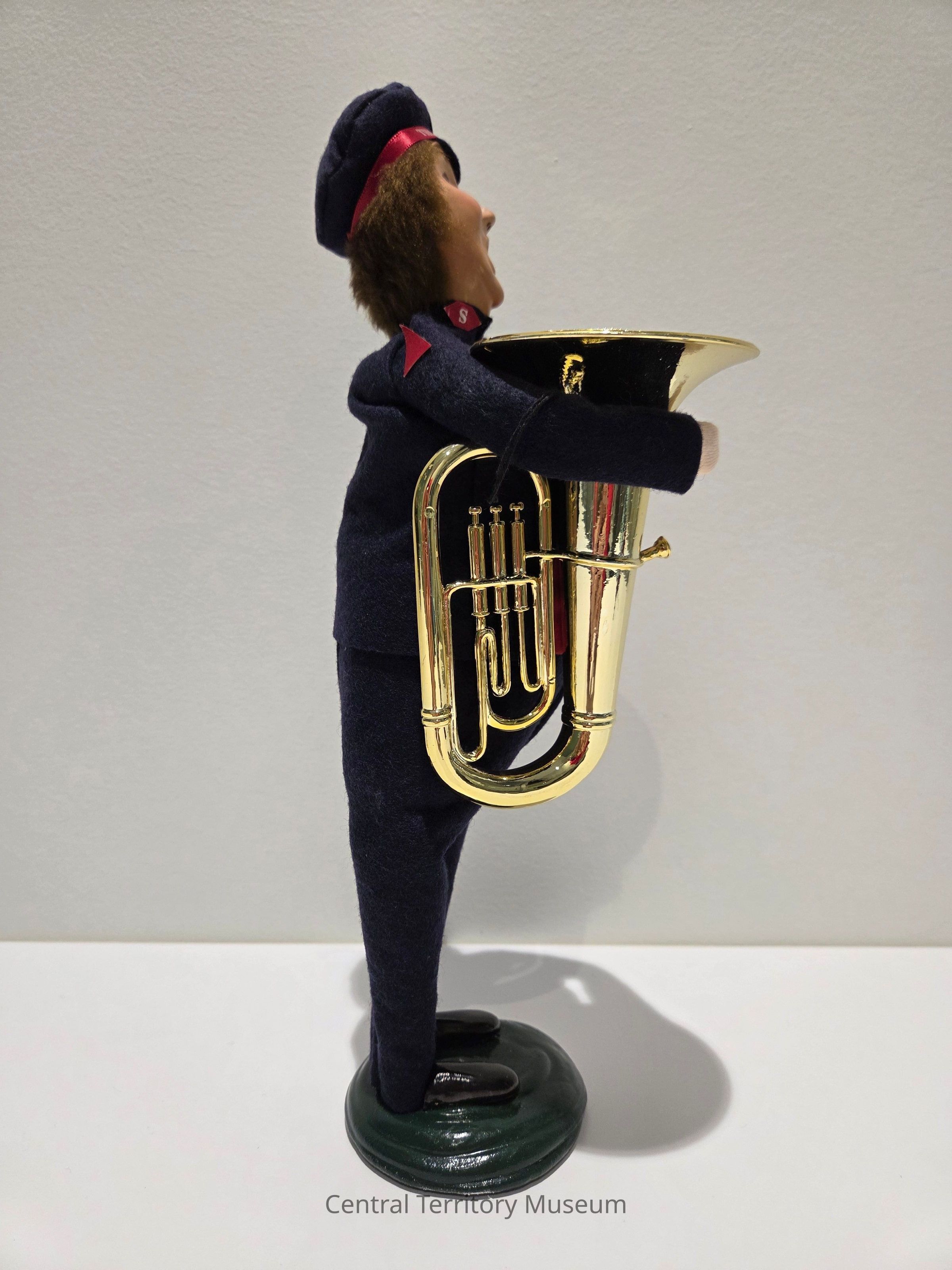 Doll. Male doll, wearing a red guernsey (sweater) with a dark blue coat over it, dark blue pants, and a dark blue cap. A red ribbon, imprinted in white The Salvation Army, is attached around the edge of the cap. A gold emblem is attached to the front of the cap. Red "S" trim is on the collar of the coat and red insignia is on the shoulders. Shaggy light brown hair frames his face. The man has his mouth open, as if he is singing. He holds a big brassy gold tuba, bell up, in his arms. He is wearing black shoes and is attached to a dark green base.Acquisition