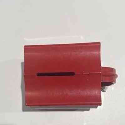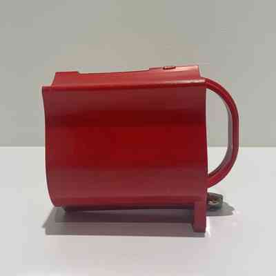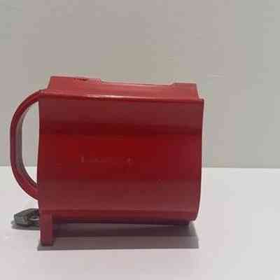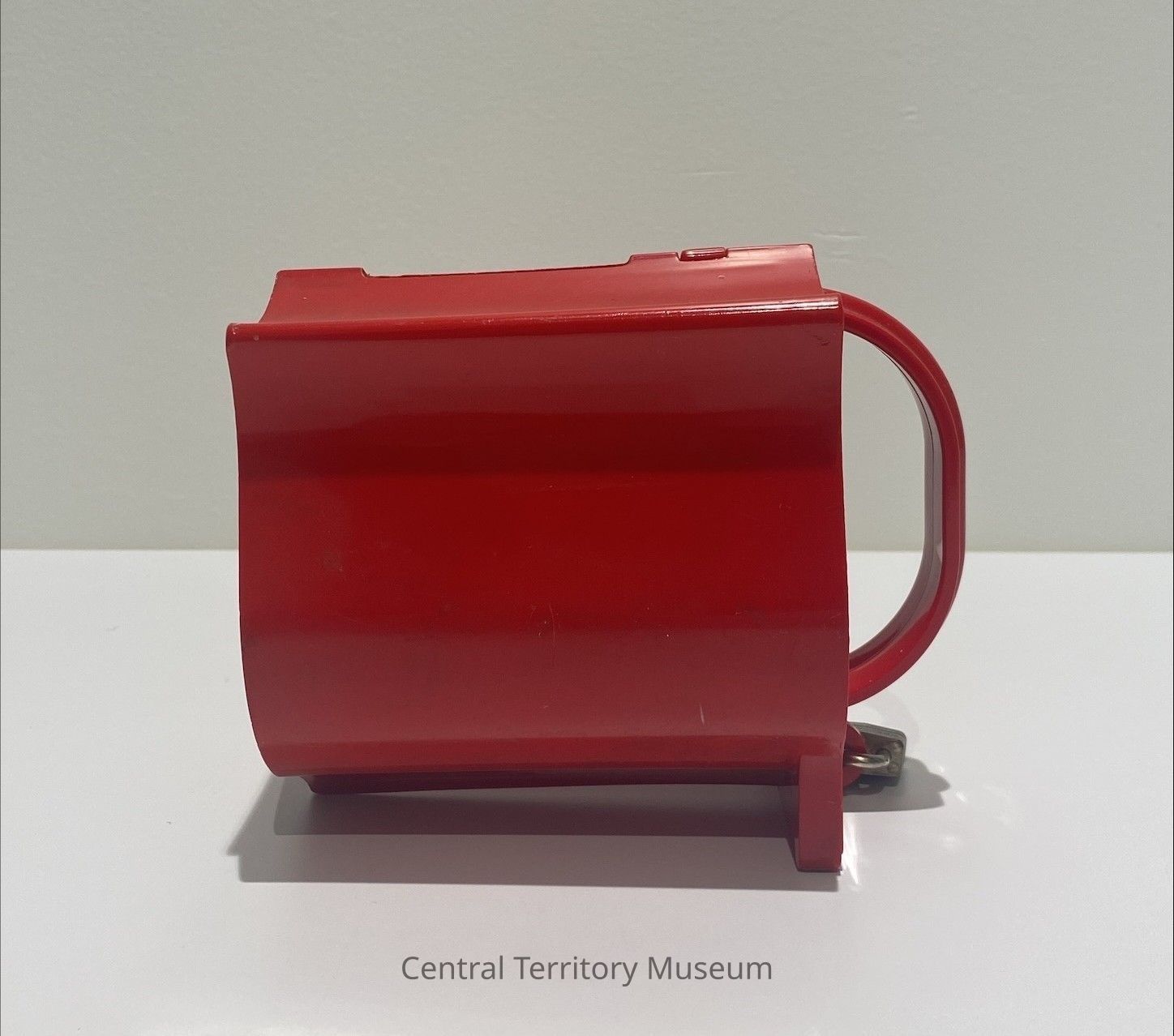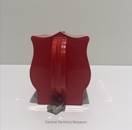Red plastic donation box, shaped like a Salvation Army Red Shield, officially called a Red Shield Serenading Collection Box. One end of the box has the Red Shield logo, outlined in white with white text. The opposite end has a curved handle in the center and a red loop for inserting the hasp of a small padlock. A small silver padlock is locked through the loop. There is no key to open. The top of the donation box has a slot for inserting coins or bills.