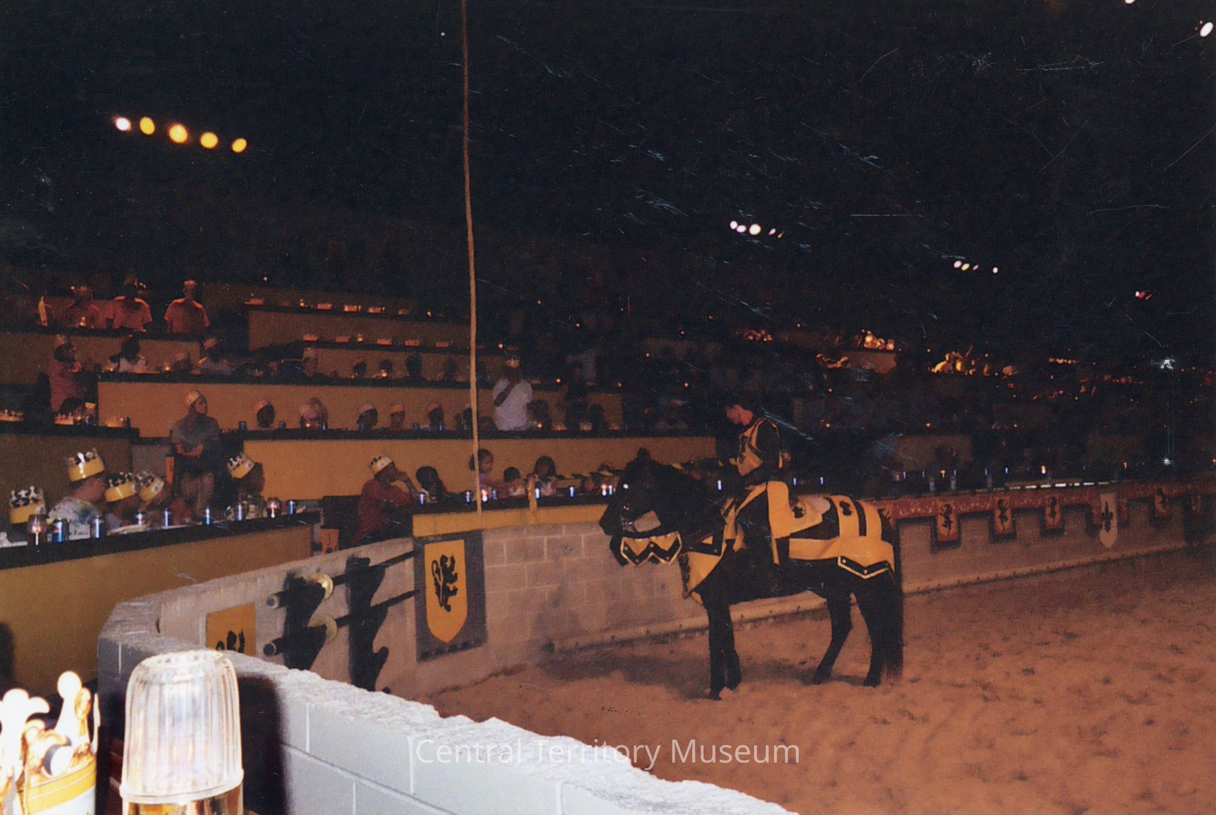 Color photo taken during a day camp hosted by the St. Charles (Tri-City), IL Corps. The photographer is shooting across an arena toward a person seated on a horse. The horse is wearing a caparison, a draped fabric decorated with heraldic symbols. Despite the lack of lighting, people can be seen seated in rows in the background. The photo was taken at Medieval Times, an entertainment venue.Acquisition