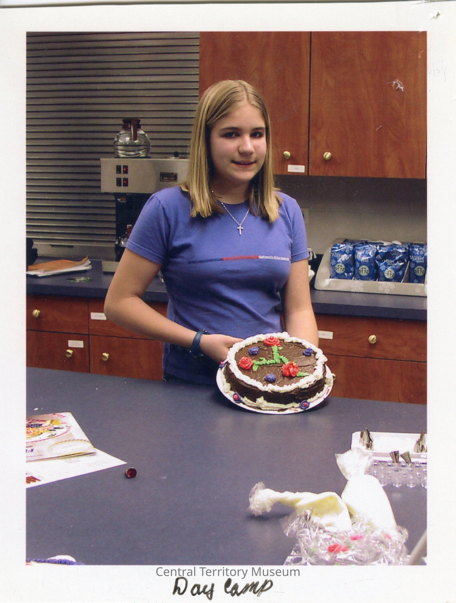 Color photo of a girl, holding a cake, during an activity at the St. Charles (Tri-City), IL Corps. She is wearing a purple T-shirt with a design across the front. Her cake has chocolate frosting with white frosting piped around the edges. The center of the cake has red and purple flowers with green stems.Acquisition