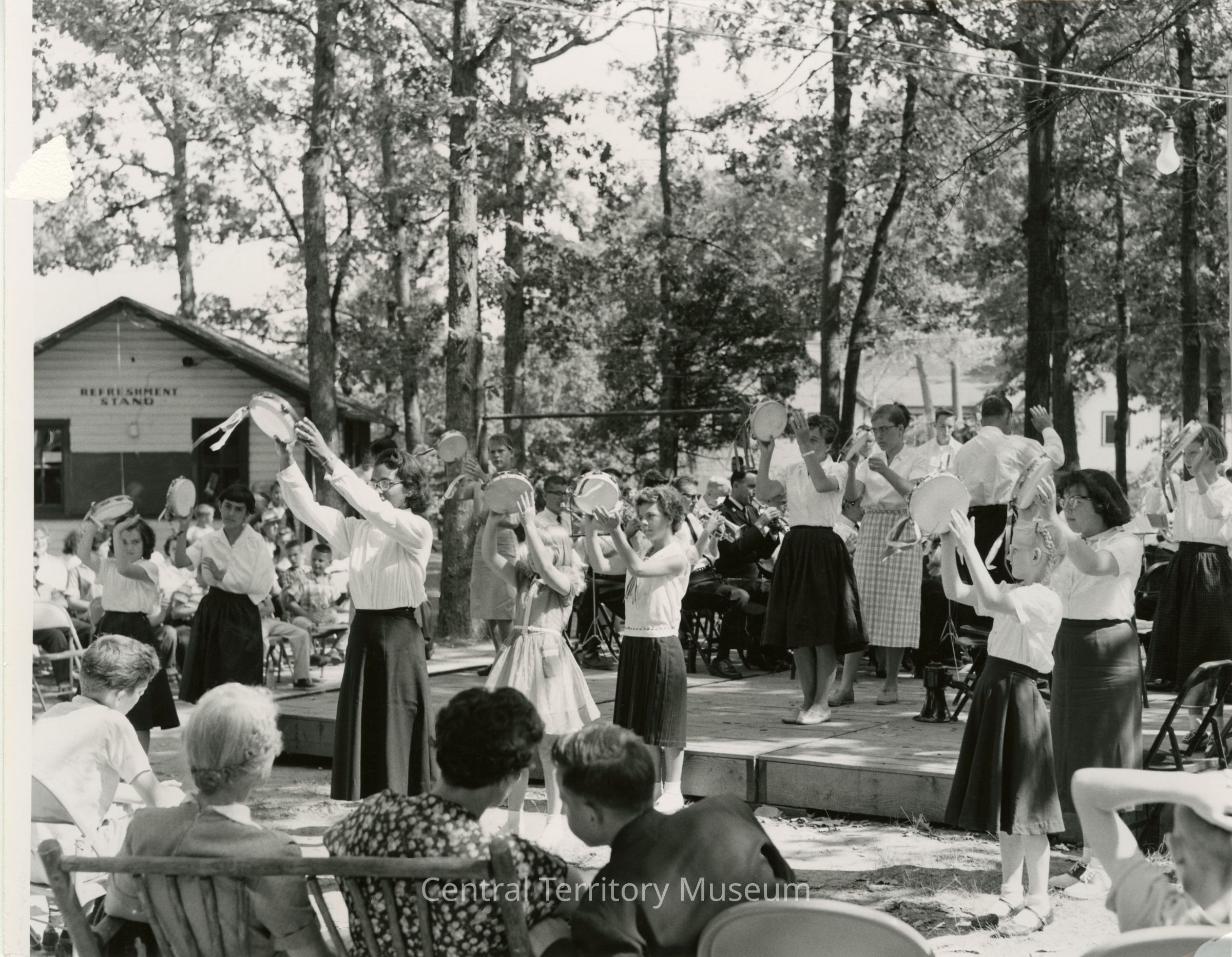 Photo of a timbrel band playing on and in front of the outdoor stage at Echo Grove Camp. People, seated on chairs and on benches, can be seen around the group. The Refreshment Stand is in the far background and a brass band is behind the timbrellists.