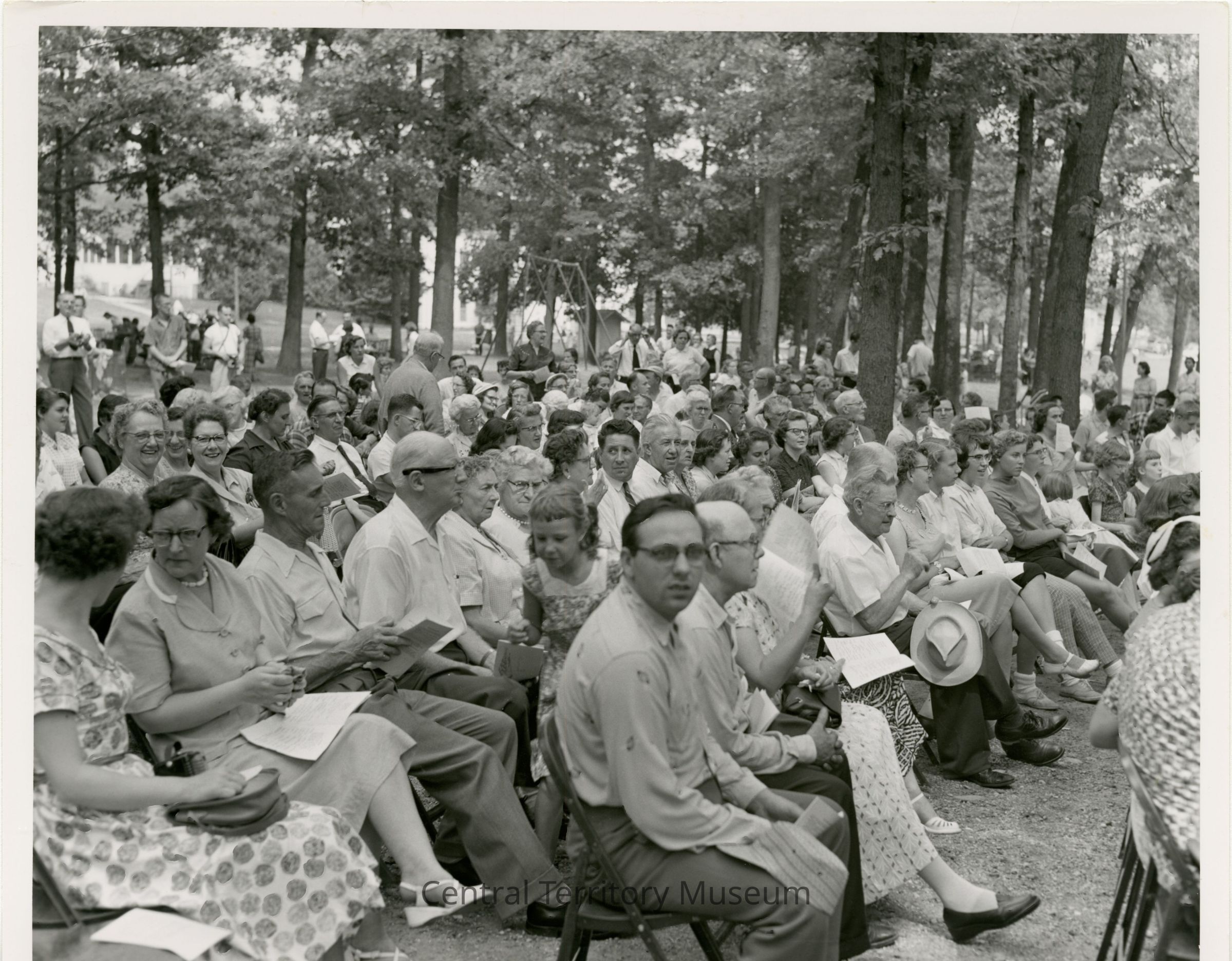 Photo of a large group of people, seated in chairs, under the trees at Echo Grove Camp. Many of the men and women appear to holding programs. Playground equipment can be seen in the background.