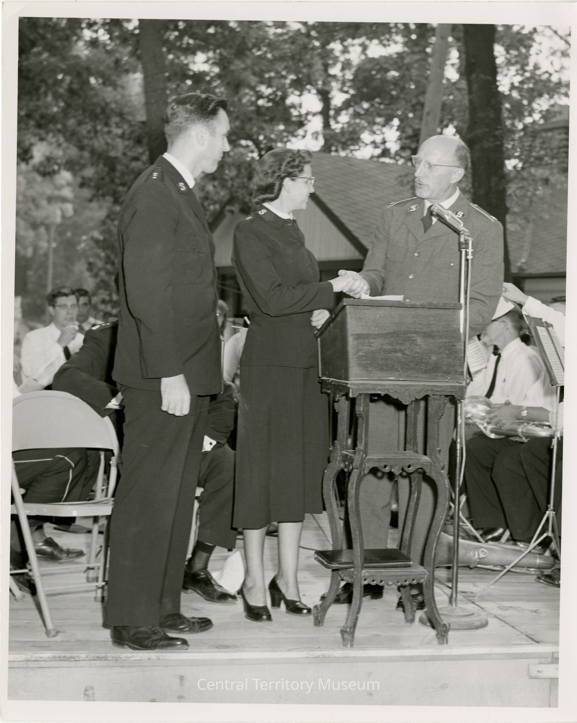 Photo of Glenn Ryan shaking hands with Esther Rawlin during a meeting at Echo Grove Camp. A small podium with a microphone is in front of them. Hubert Rawlin is standing on their right (photo left).