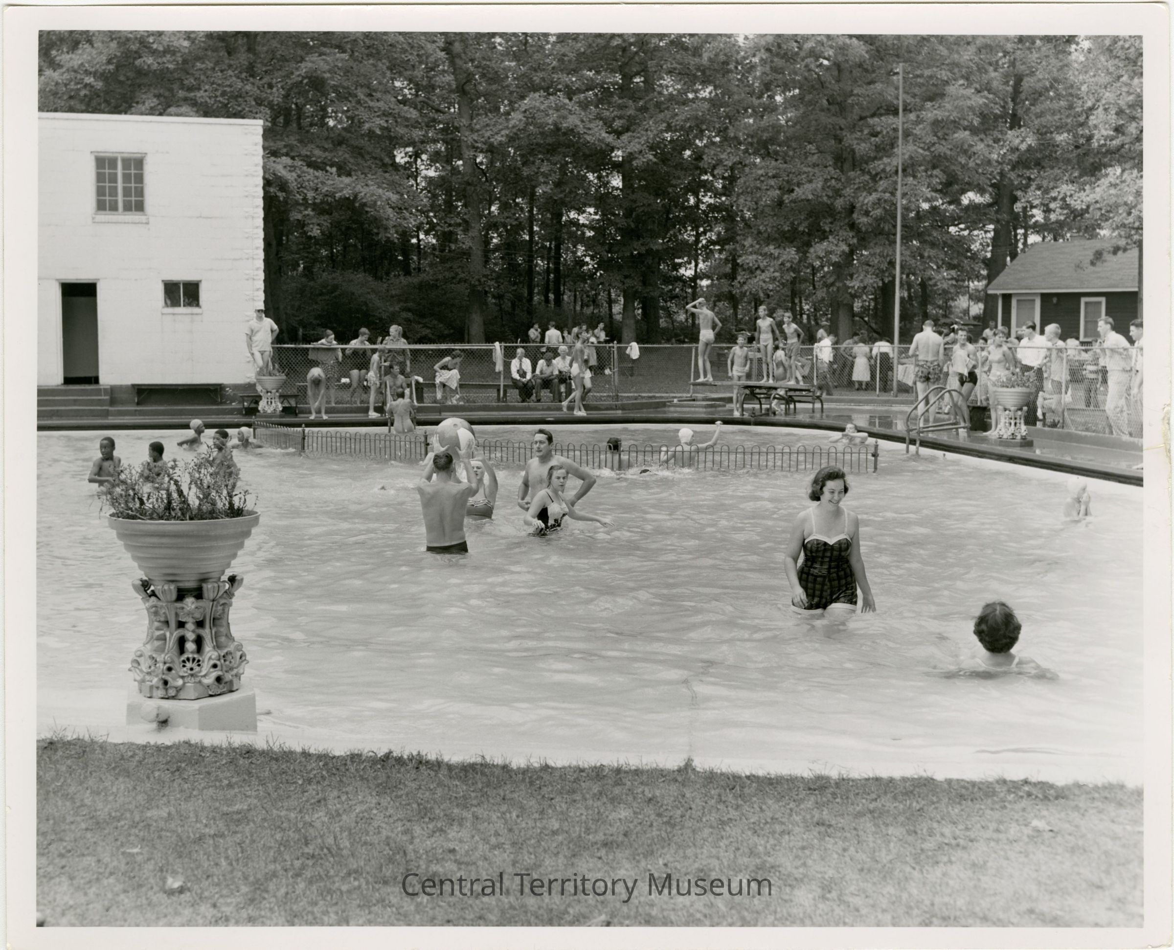 Photo of people in the swimming pool at Echo Grove Camp. A man and a woman are playing with a plastic beach ball in the center. A group of kids are lined up on the diving board while other people are standing on the pool deck. A chain link fence separates the pool from a wooded area where where people are seated watching the swimmers. A white two story building can be seen on the left and a dark brown cabin is on the right.