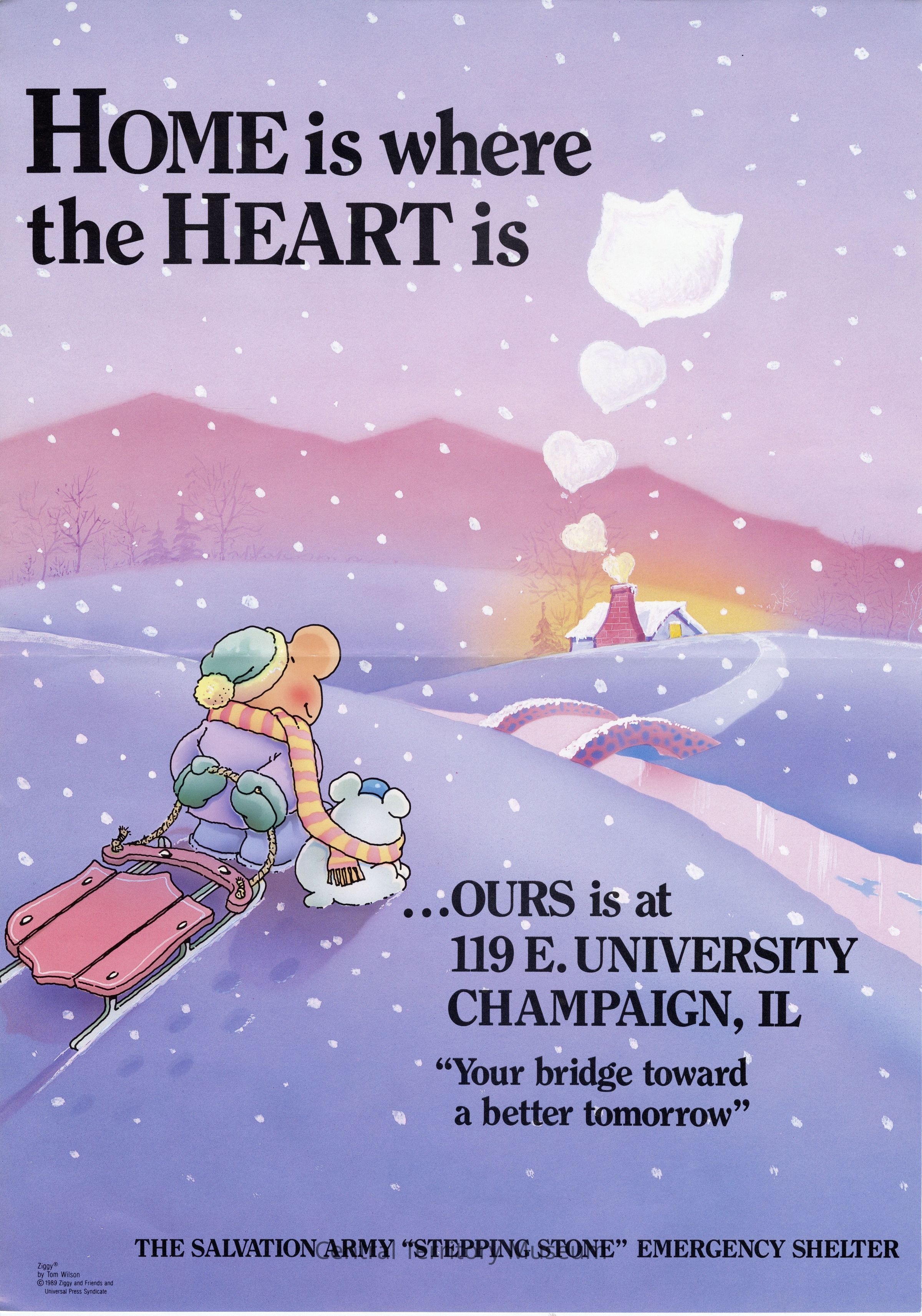 Color poster featuring the cartoon character Ziggy, pulling a sled, and looking across a wintry scene toward a house with smoke, shaped like Salvation Army Red Shields, coming from the chimney. Ziggy is wearing a winter coat, stocking cap, and a striped scarf that he is sharing with a small white dog, Fuzz, next to him. Black text: HOME is where the HEART is : is printed in the upper left corner. In the lower right corner, black text is printed: ...OURS is at 119 E. UNIVERSITY CHAMPAIGN, IL / "Your bridge toward a better tomorrow". More black text is printed along the lower edge: The Salvation Army "Stepping Stone" Emergency Shelter. The cartoonist, Tom Wilson, publishing information, and date are printed in the lower left corner.Acquisition