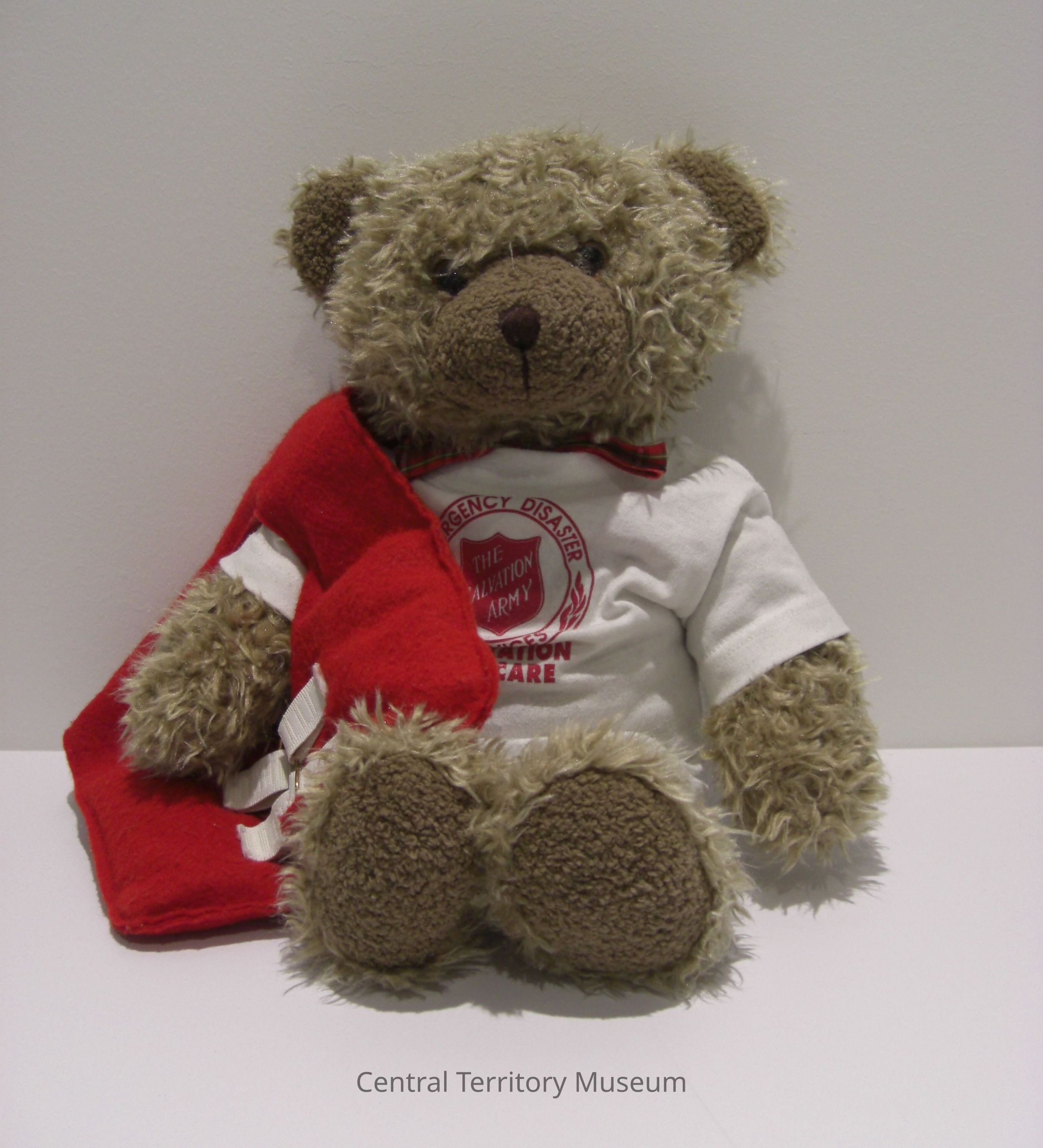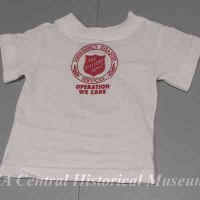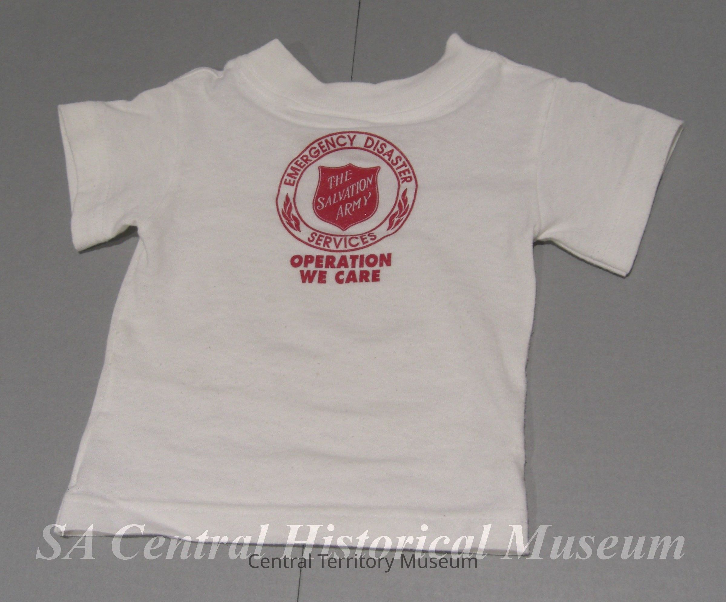 T-shirt (b) - White cotton with Emergency Disaster Service logo in red printed on back. Under logo in red is, "Operation We Care." Manufactured by Beetle Bug.