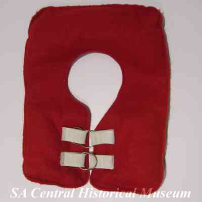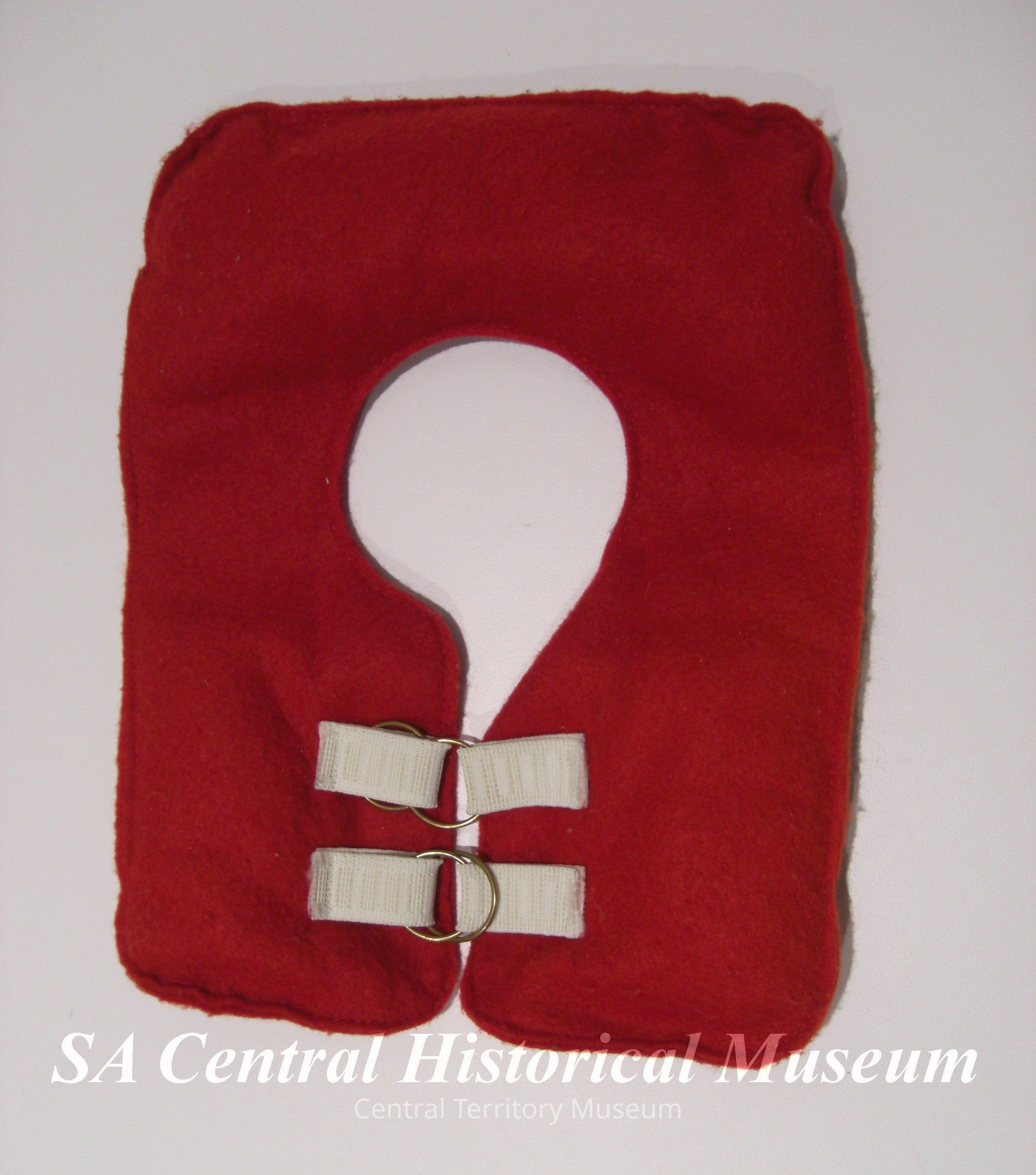 Life jacket (c)- Red felt with two white buckle elastic closures with goldtone rings.