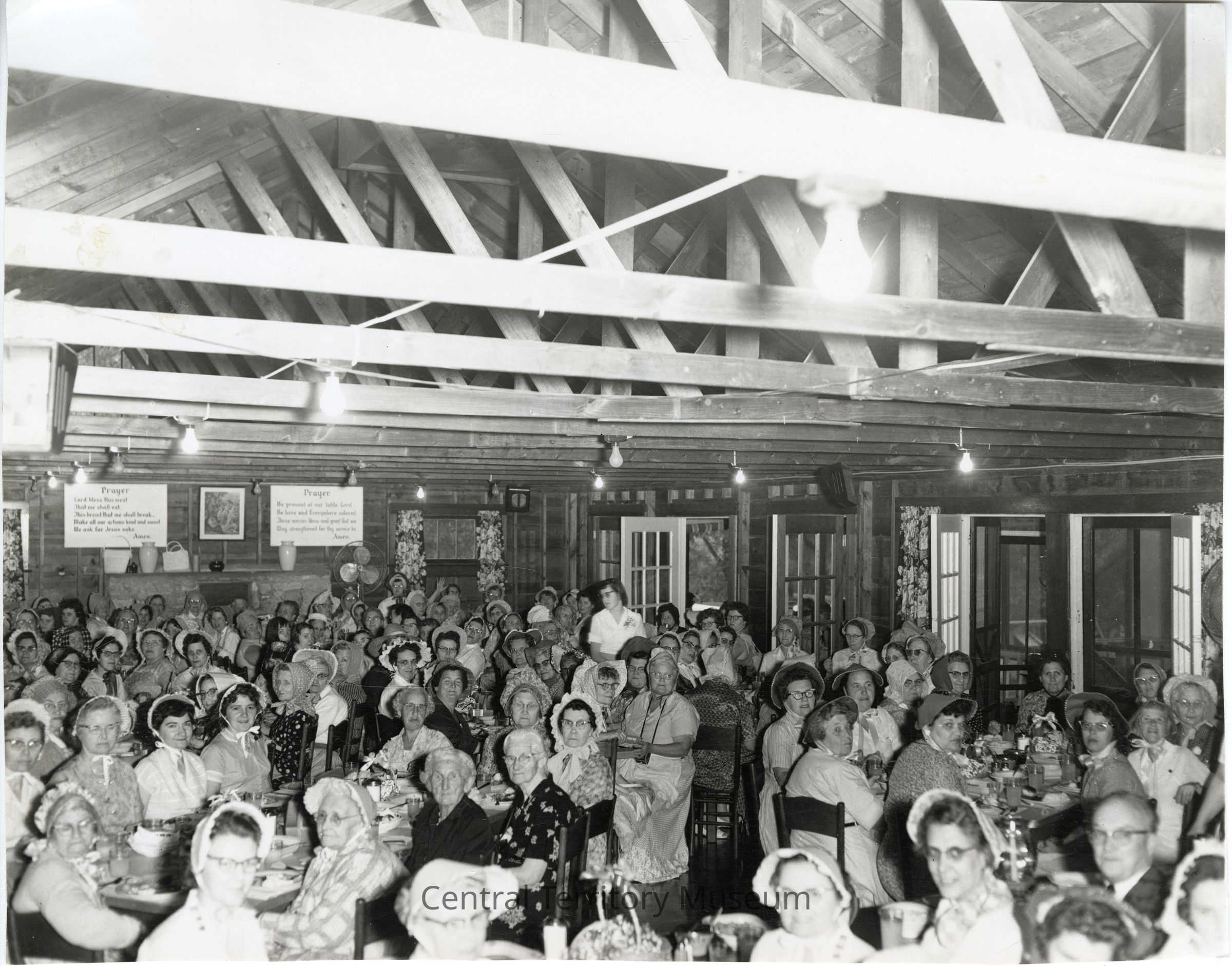 Group photo, taken inside the dining hall at Camp Mokan. The women are dressed up as pioneers for a themed dinner.