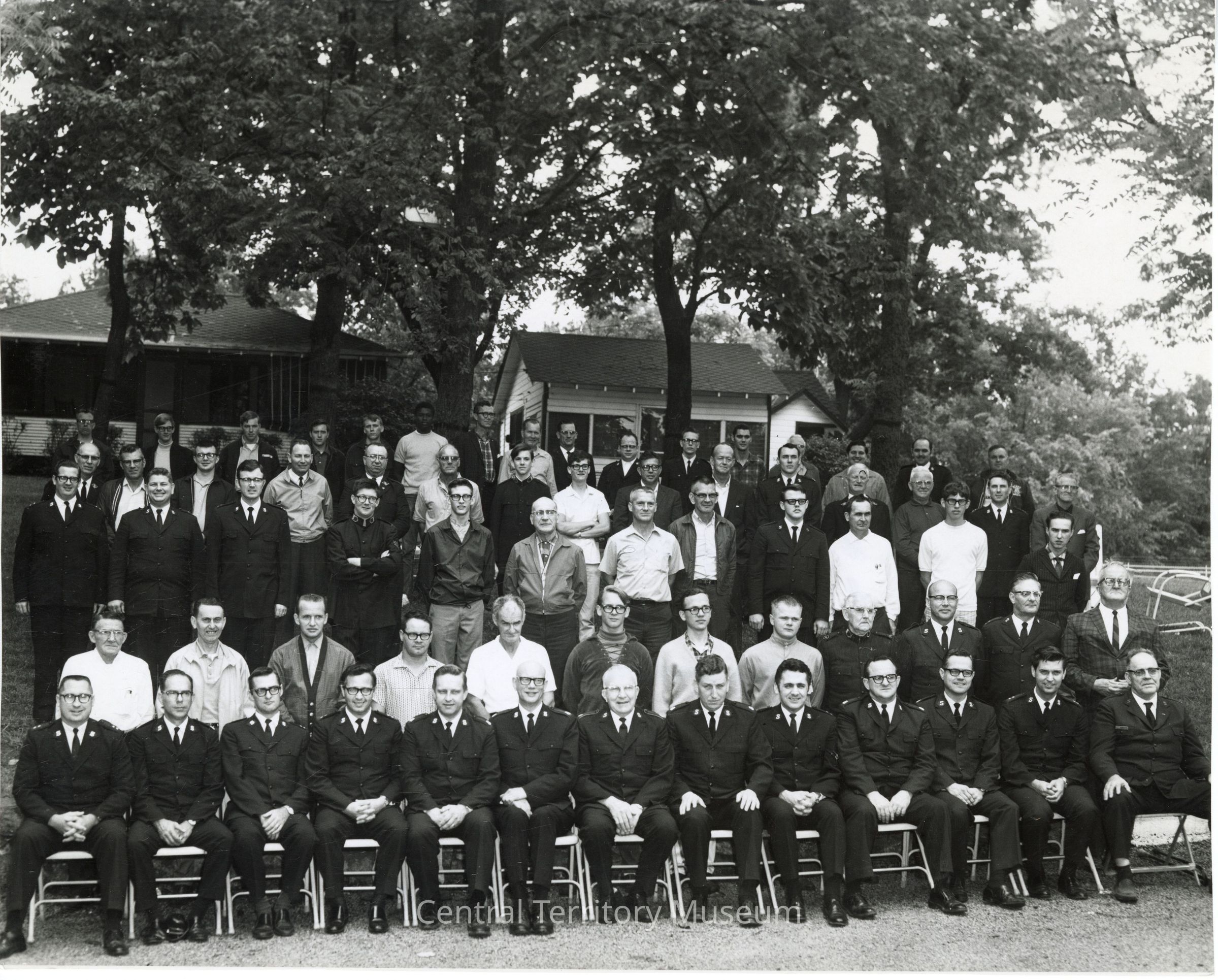 Group photo of the men attending the Men's Camp at MoKan in the 1950s. There are two rows of men sitting and three rows of men standing behind. The cabins can be seen in the far background.