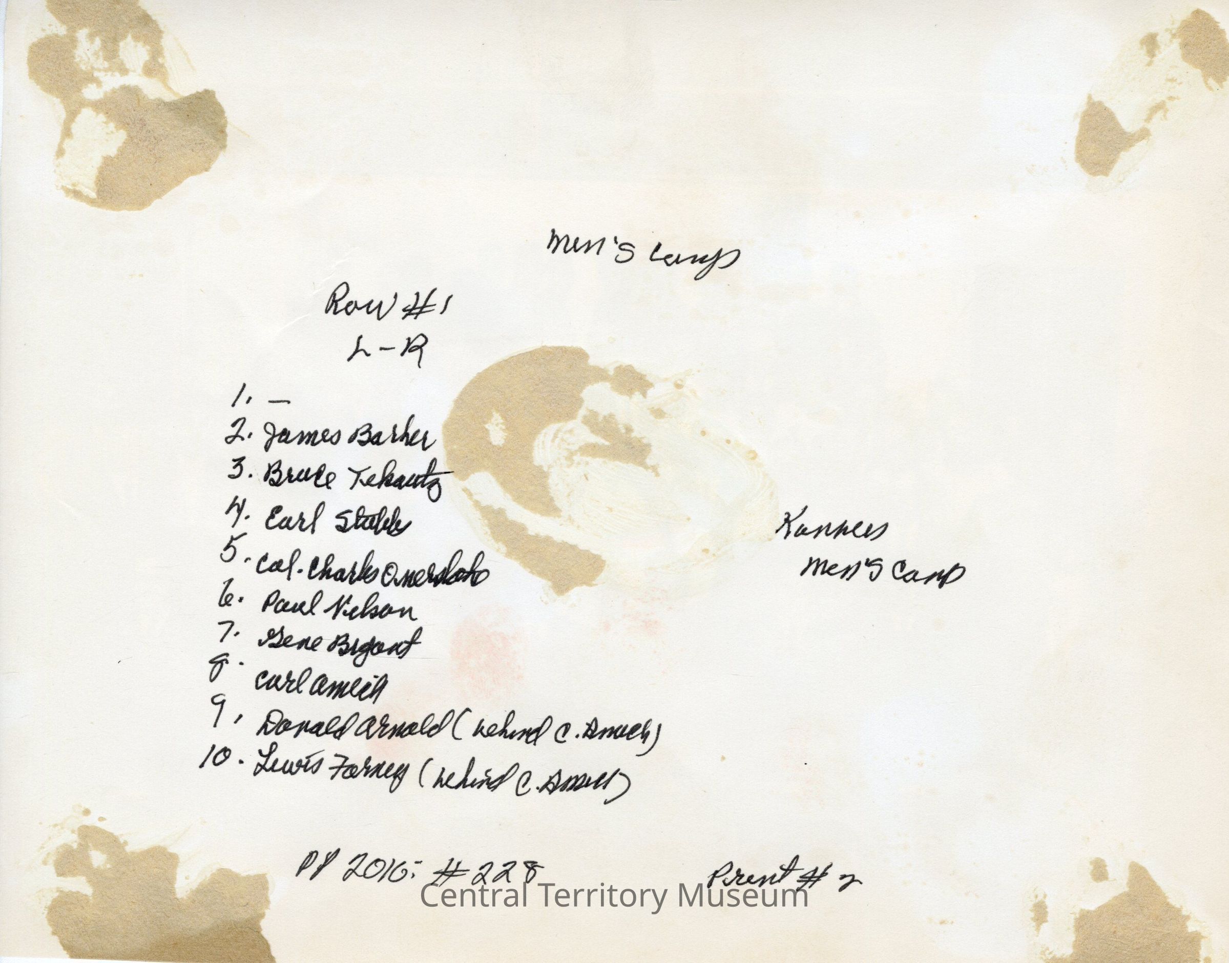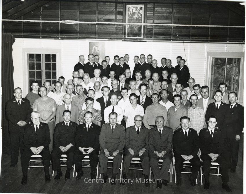Group photo of the men attending the Men's Camp at Camp MoKan. The photo is taken inside a building with the first row of men seated and the next five rows of men standing. A sixth row of men are standing but probably are elevated on a platform.