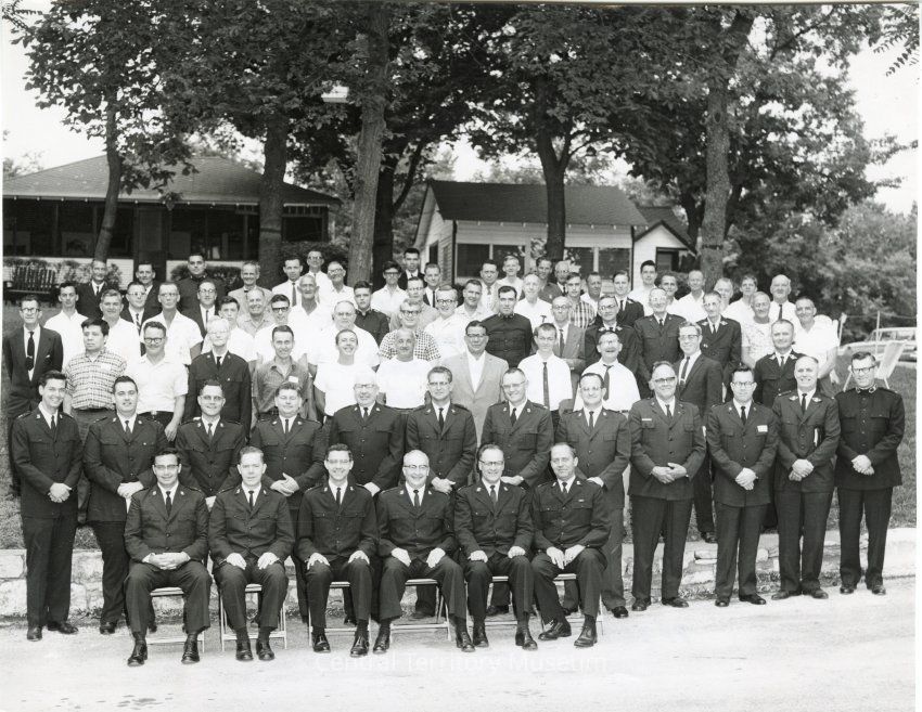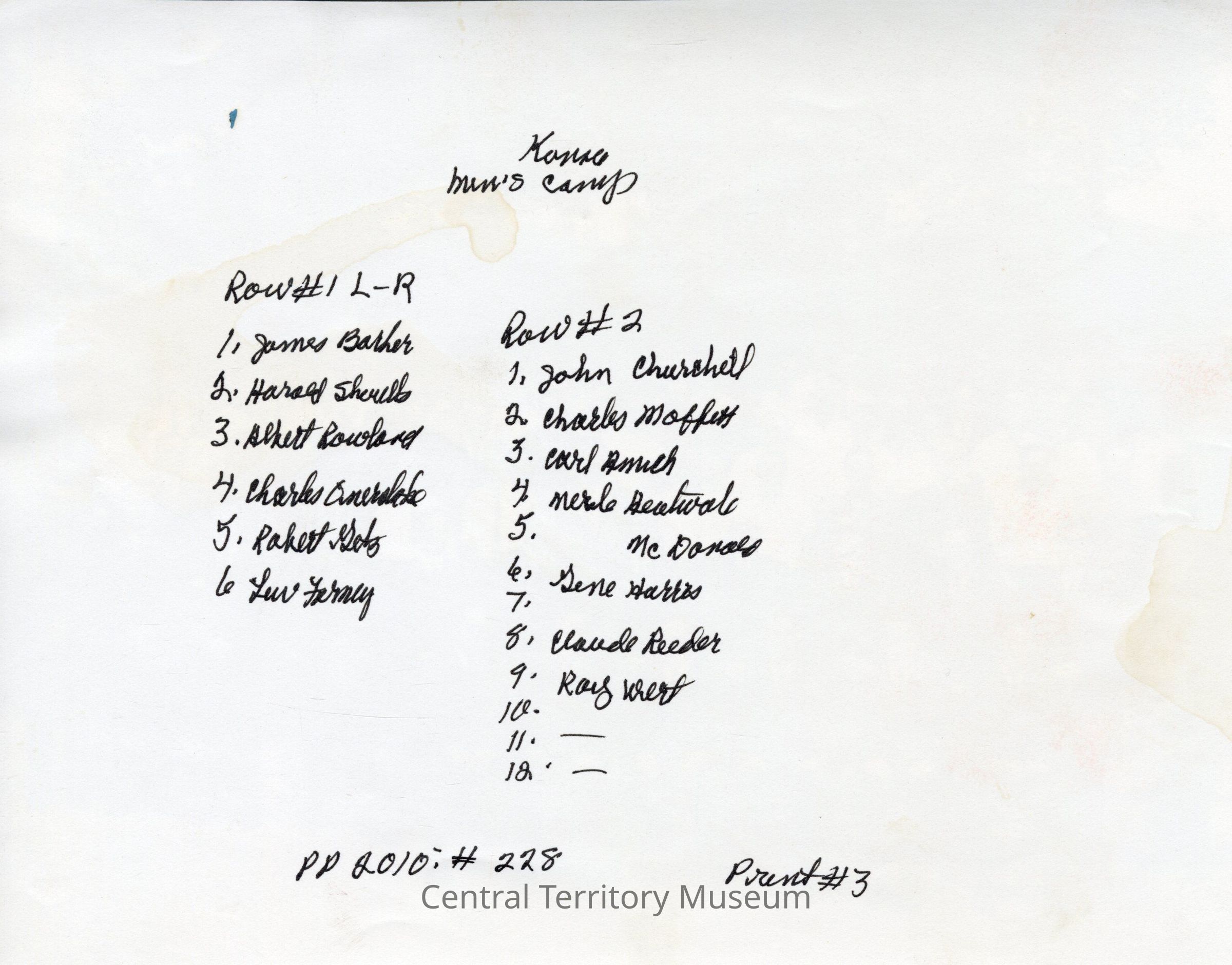 Group photo of the men attending the Men's Camp at Camp MoKan. The photo is taken outdoors, with a row of men seated in front and the remaining men standing in rows behind them. Cabins can be seen in the background.