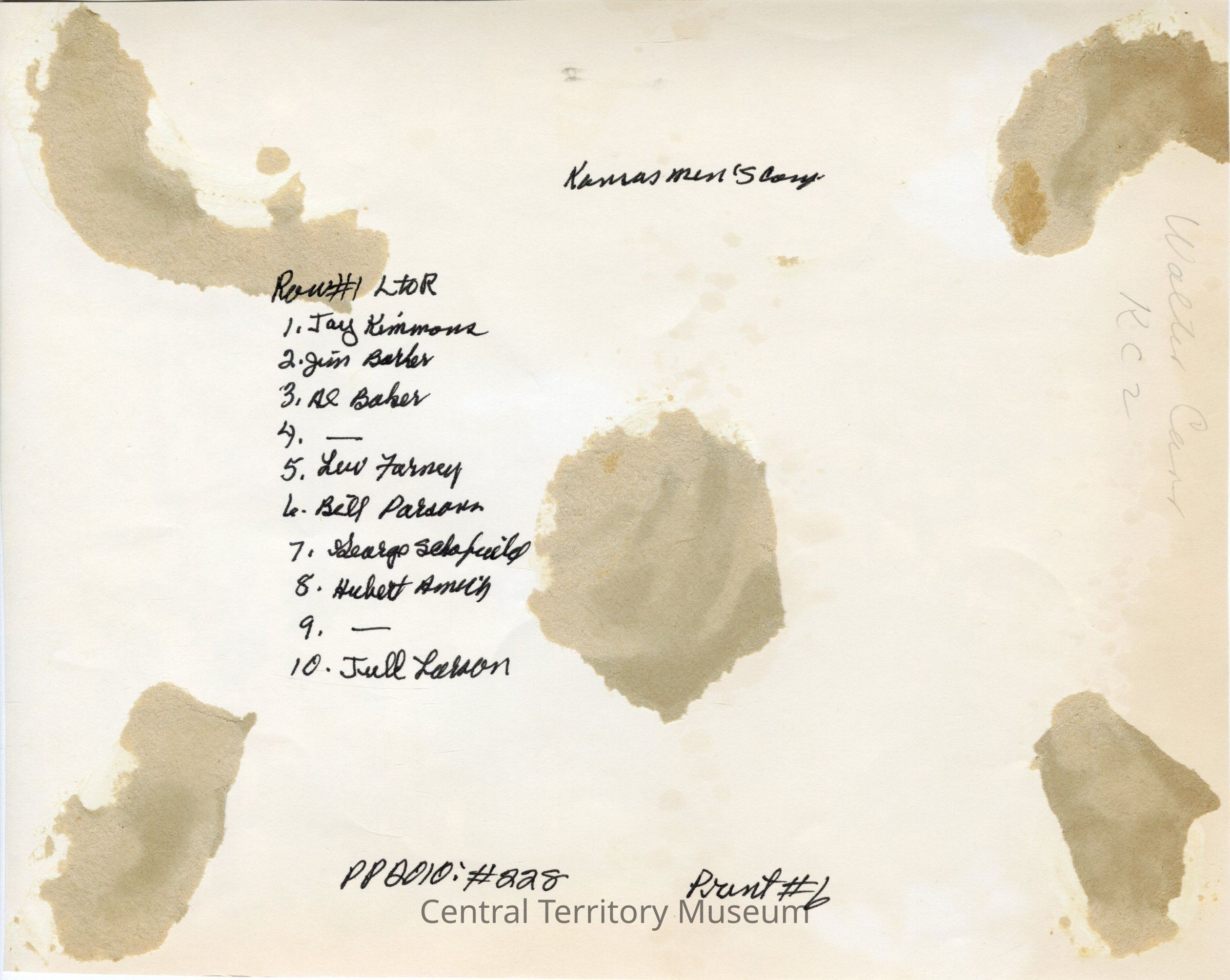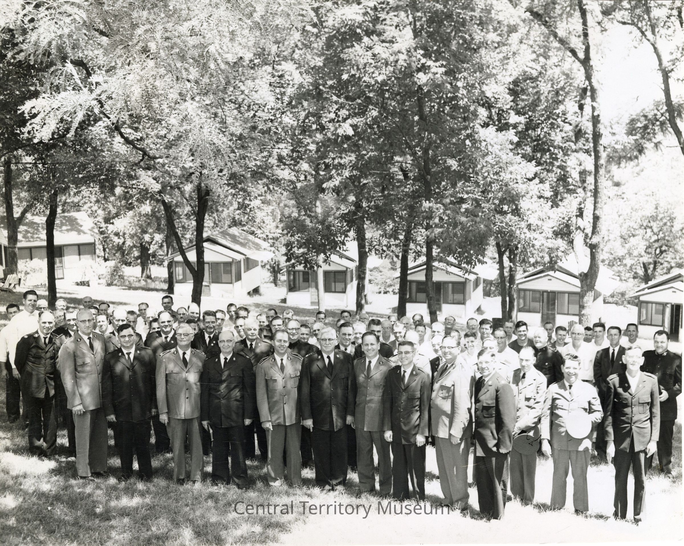 Group photo of the men attending the Men's Camp at Camp MoKan. The photo is taken outside, near a group of cabins. The men are standing in rows on the lawn.