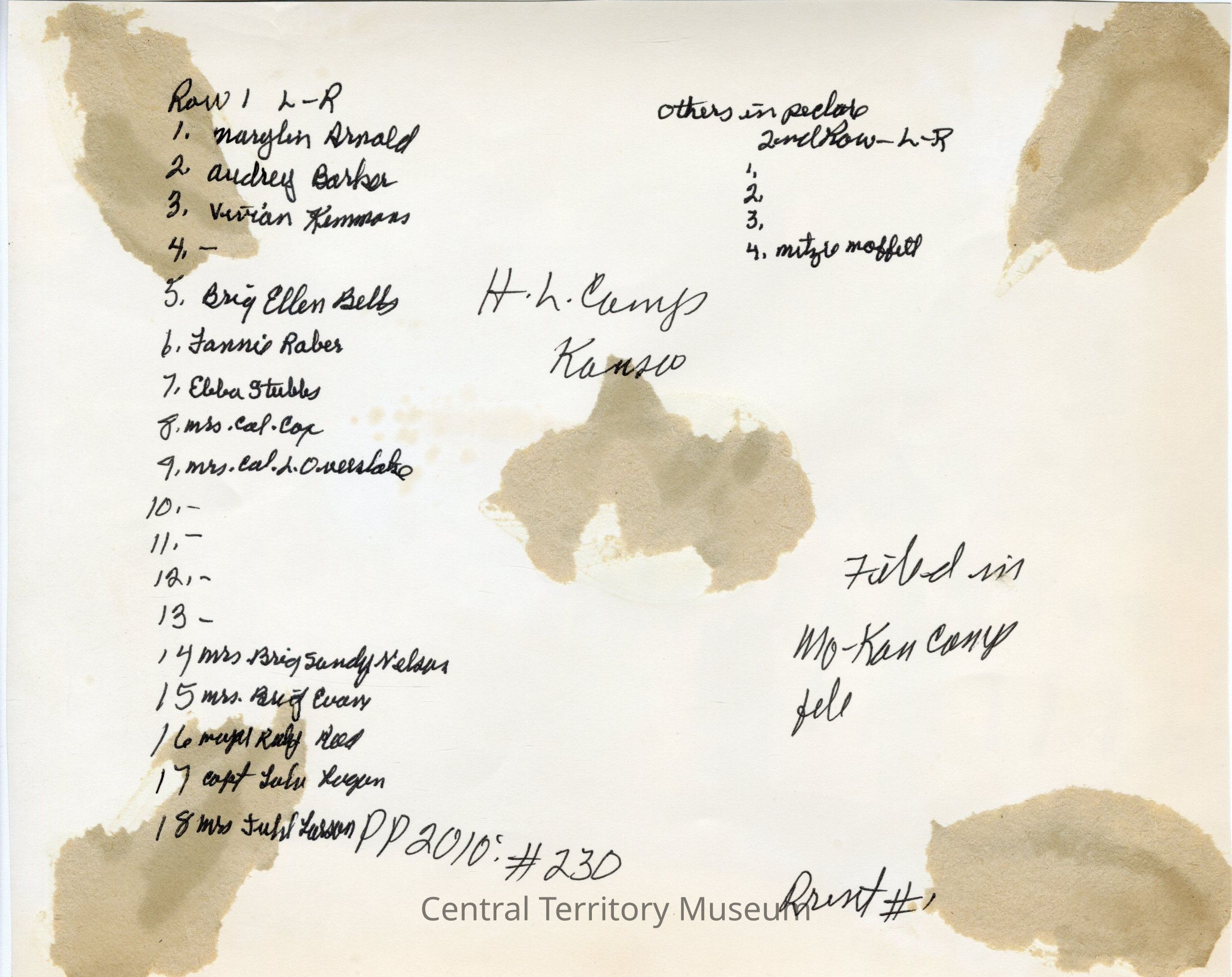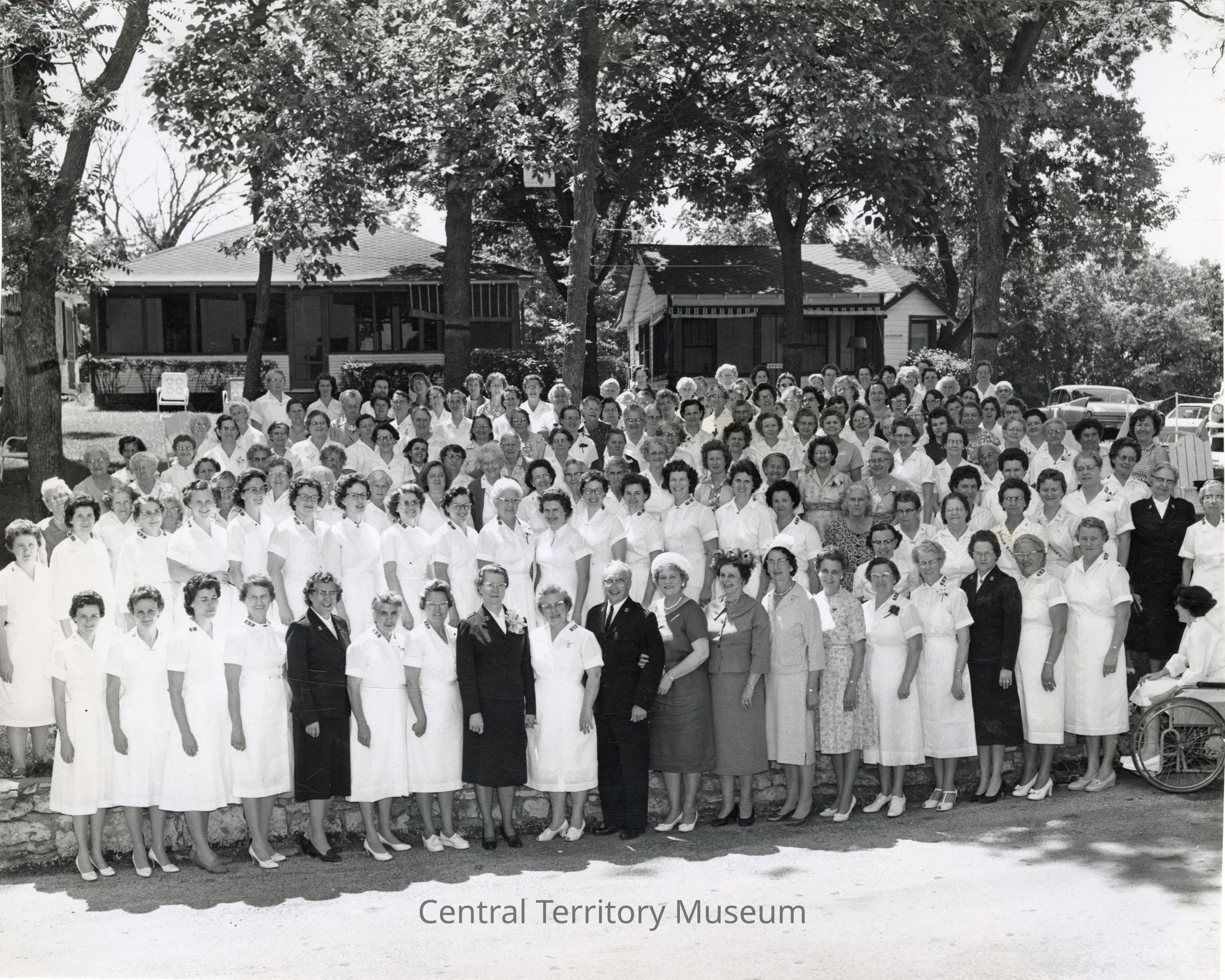 Photo of the women attending the Home League Camp at Camp MoKan. The women are assembled outside with many of them wearing white uniforms or dark blue uniforms. A man is standing in the front, center, surrounded by the women. One woman, on the far right of center row is seated in a wheelchair.Acquisition