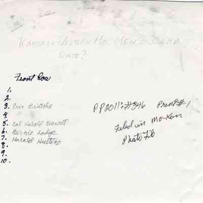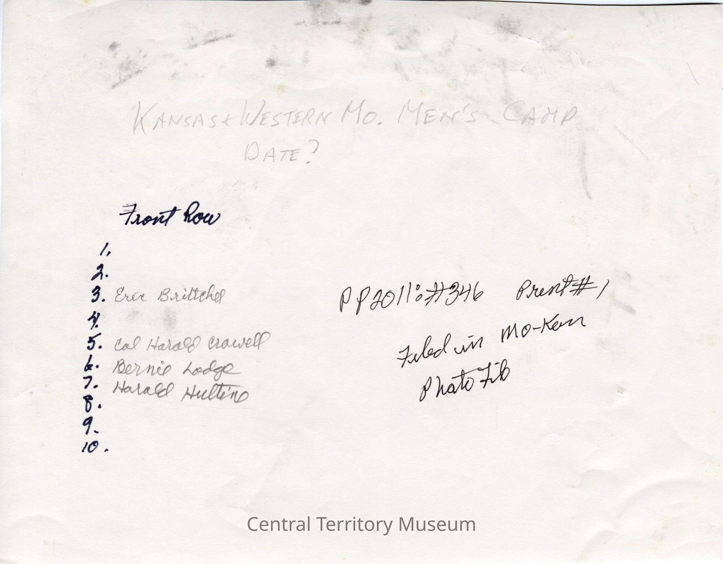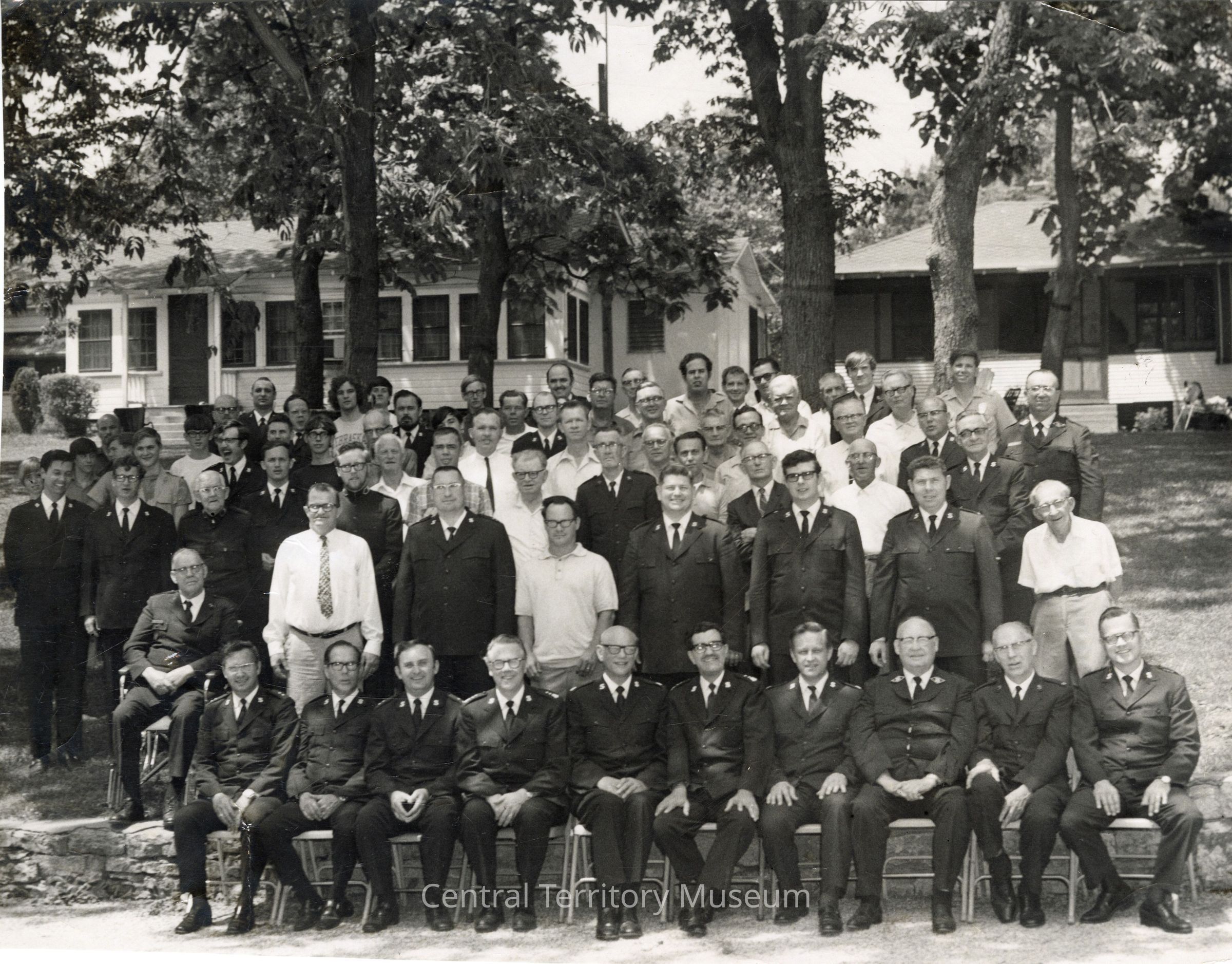 Photo of the group of men and boys attending Men's Camp at Camp MoKan. A group of men, wearing Salvation Army uniforms, are seated on chairs in the front row. Two cabins can be seen in the background.