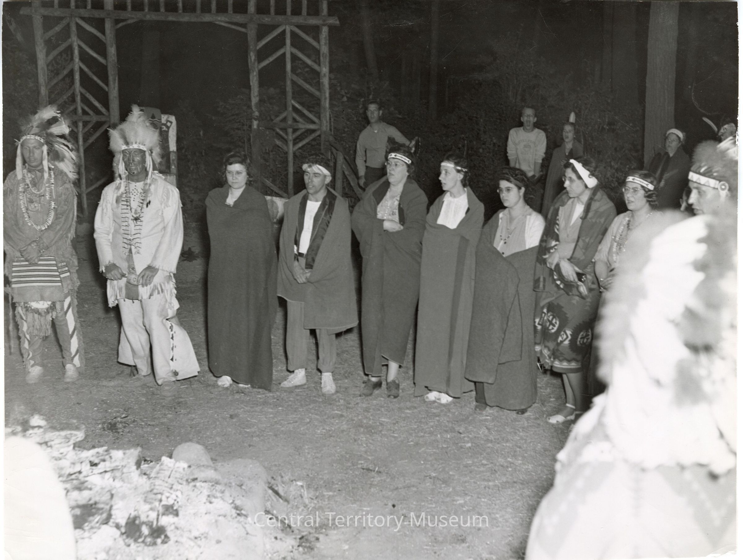 Photo of the Black Arrow council ring at Camp Mokan. The photo depicts an evening meeting with a group of men, women, girls and boys are dressed in array of Black Arrow costumes or wrapped in blankets. In the background, an elaborate wood gateway forms an entrance into the ring.