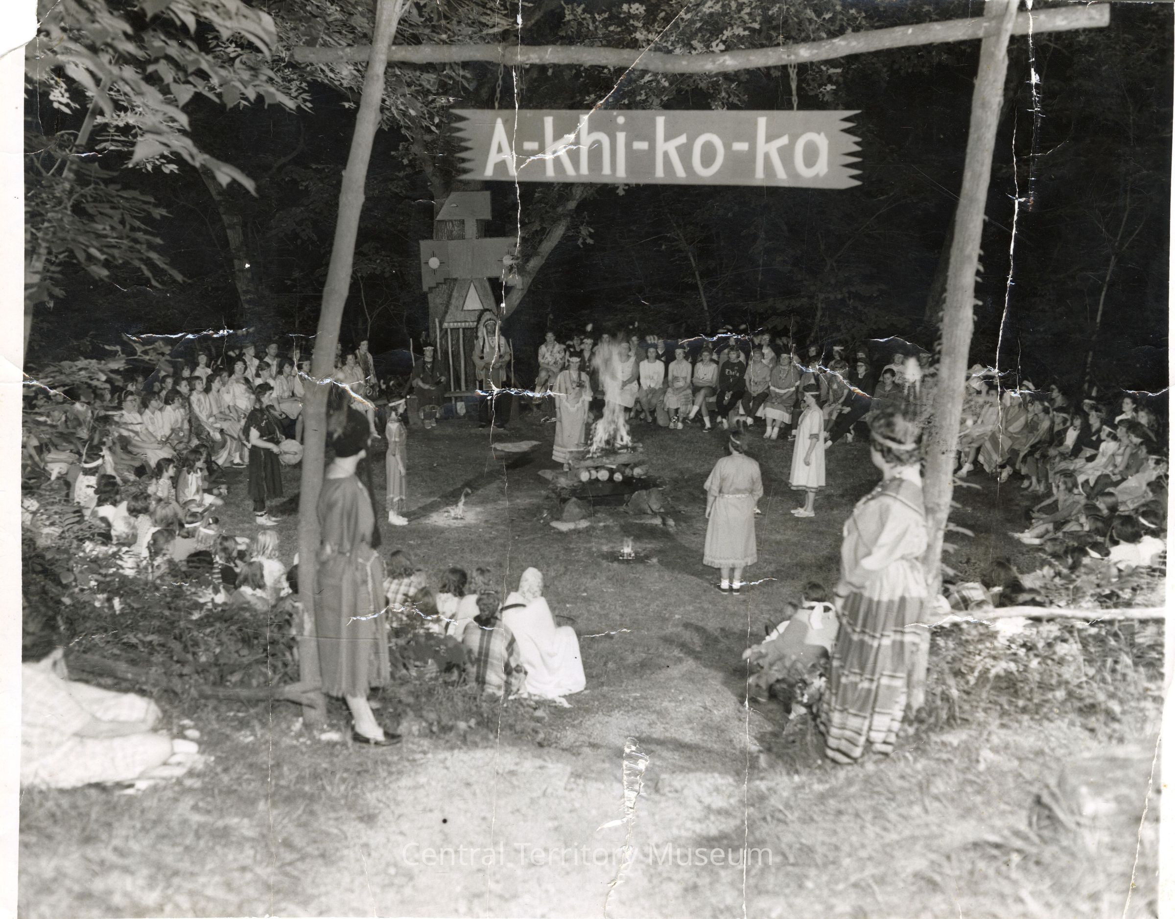 Photo of a Black Arrow Council Ring at Camp MoKan. The photo depicts a large group of men, women, boys, and girls gathered in a circle, either sitting in chairs or on the ground. In the foreground, two women stand next to two upright poles with a crossbar holding a sign A-khi-ko-ka, watching a group of women and girls performing a ceremony around a large campfire. In the background, a man is seated with his back to a tree decorated with a large thunderbird sign. People are wearing an array of Black Arrow costumes or are wrapped in blankets.Acquisition
