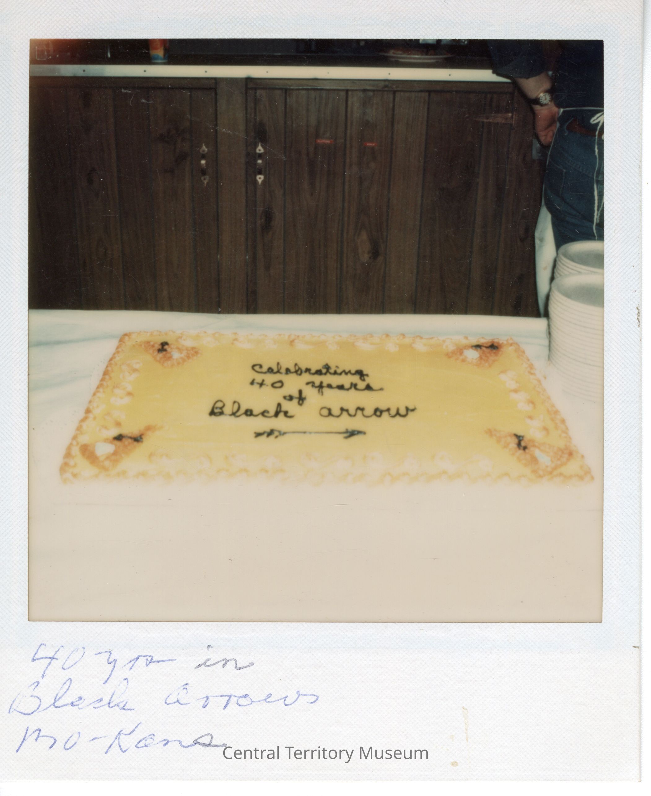 Color photo of a decorated sheet cake, served at the celebration of 40 Years of Black Arrow at Camp MoKan. The cake has a yellow background and emblems in each corner. The center has black icing spelling out Celebrating 40 Years of Black Arrow with a black feathered arrow under.