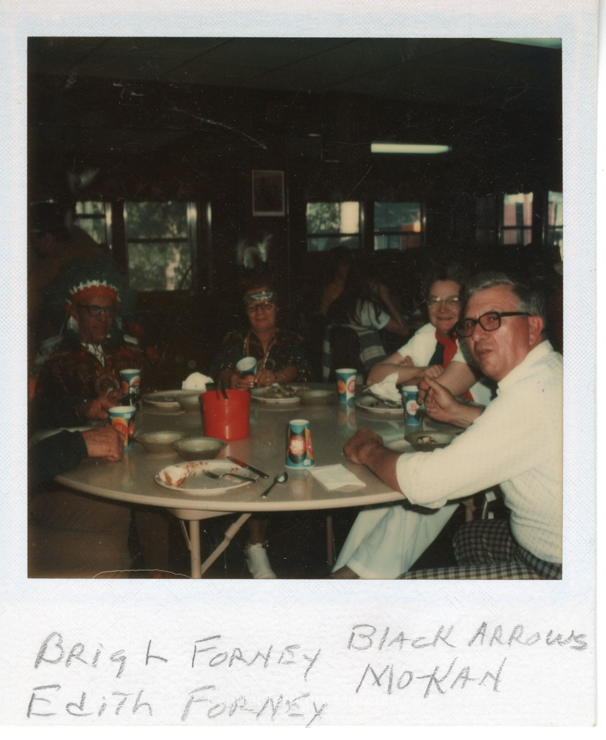 Color photo of a group of men and women seated around a round dining table. The table has paper plates and drink cups on it. The man on the left is wearing a feather bonnet and the woman in the center has a beaded headband. The other woman & man at the table are wearing regular clothing.