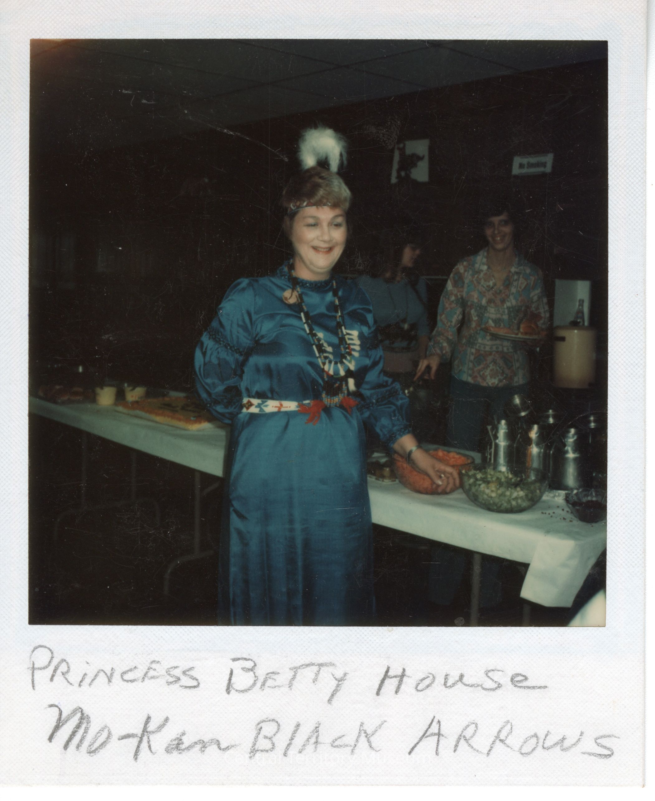 Color photo of a woman, Betty House, wearing a dark turquoise dress, a beaded belt, a beaded medallion, and a beaded headband with a feather. She is standing next to a long banquet table with an array of food.