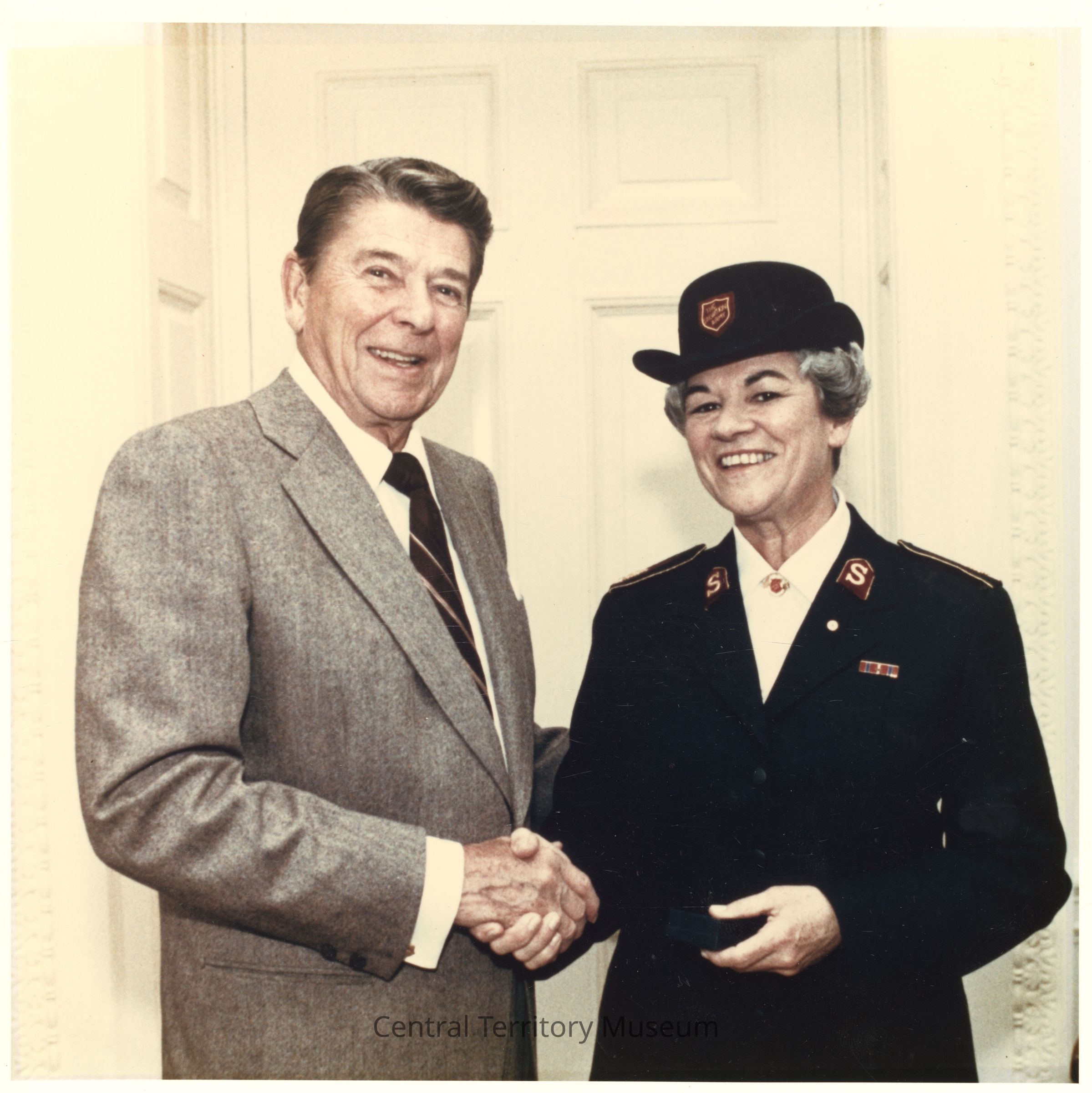 This photo depicts President Ronald Reagan, wearing a light gray suit, standing next to General Eva Burrows. The two leaders are shaking hands as they pose for the photographer.