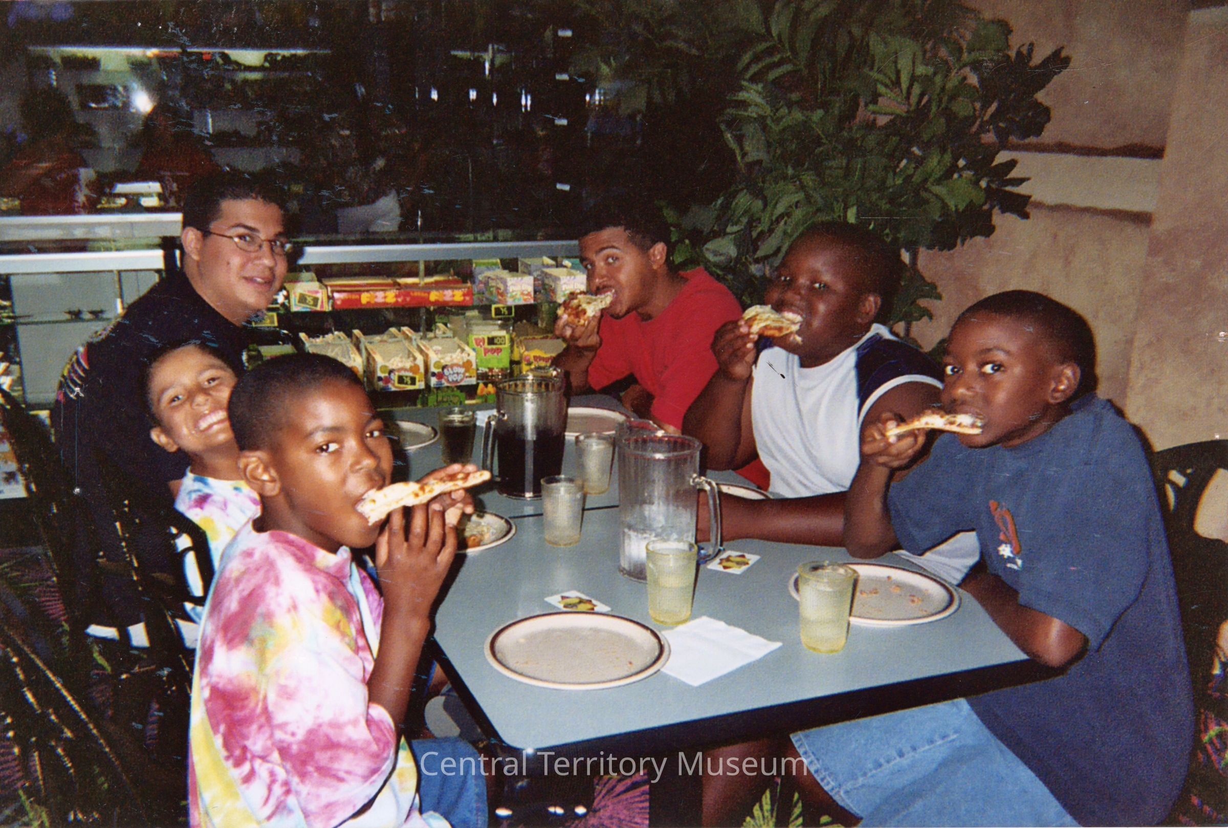 Color photo taken during a day camp hosted by the St. Charles (Tri-City), IL Corps. A group of five Black boys and an adult male sit at a table eating pizza. Pitchers of soda and drinking glasses as well as plates can be seen on the table.